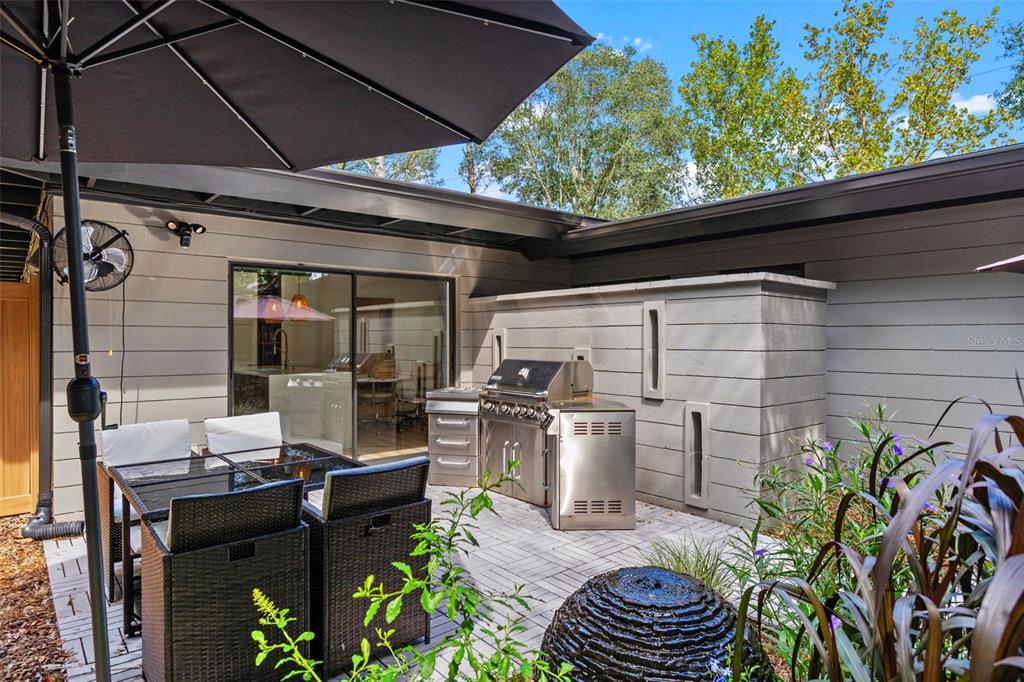The living room features a dramatic 20’ x 12’ wall of windows overlooking the pond, fountain, and park, along with a striking floor-to-ceiling brick wood-burning fireplace that anchors the space. The designer kitchen is centered around a quartz waterfall island with seating and overlooks the patio and private garden. Clean modern lines define the space with concealed outlets, integrated controls, and a concealed dishwasher, while custom cabinetry includes full pull-out drawers for exceptional functionality and storage.