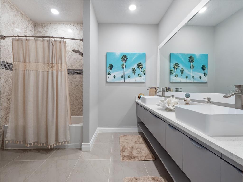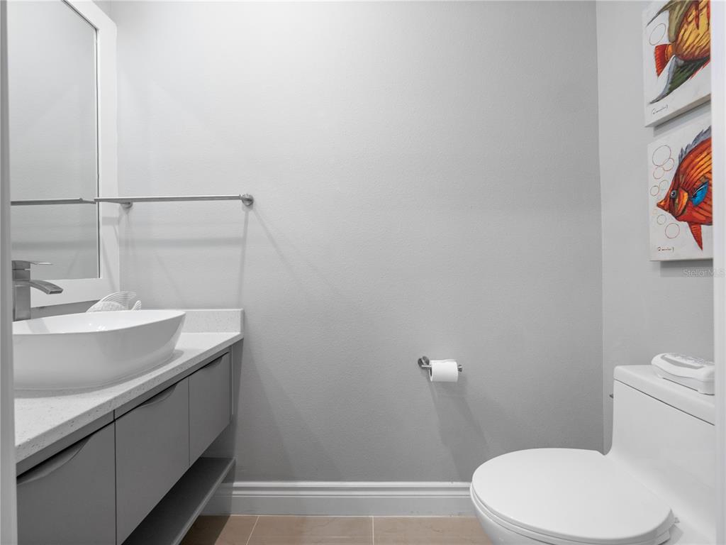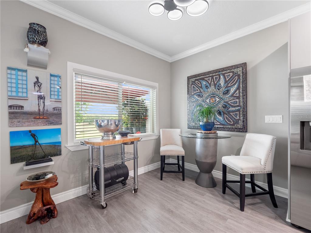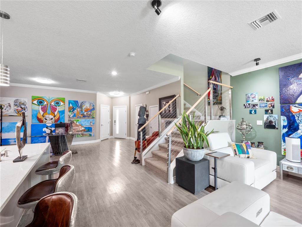 The modern kitchen is a showstopper, featuring white quartz countertops, European-style cabinetry, a large center island with a wine fridge, and ample seating for entertaining. A formal dining area provides space for gatherings or can be used as a flex room to fit your lifestyle.