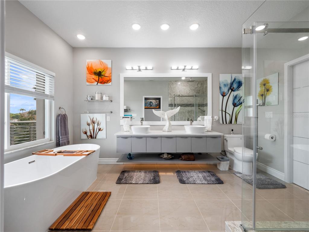 Upstairs, all bedrooms are carpeted with plush Berber carpet. The primary suite is a relaxing retreat with tray ceilings, private balcony access, and breathtaking sunrise views over the golf course. The ensuite bathroom boasts floating cabinetry, a soaking tub, separate marble-tiled shower, and modern hardware, along with a custom walk-in closet. Two additional bedrooms overlook the front of the home and offer plenty of space. Providence is an amenity-rich community featuring a lap pool, resort-style pool with slide, tennis courts, fitness center, playground, dog park, and a championship 18-hole golf course designed by Michael Dasher. The clubhouse includes a full-service bar and restaurant, perfect for socializing or unwinding after a round of golf.