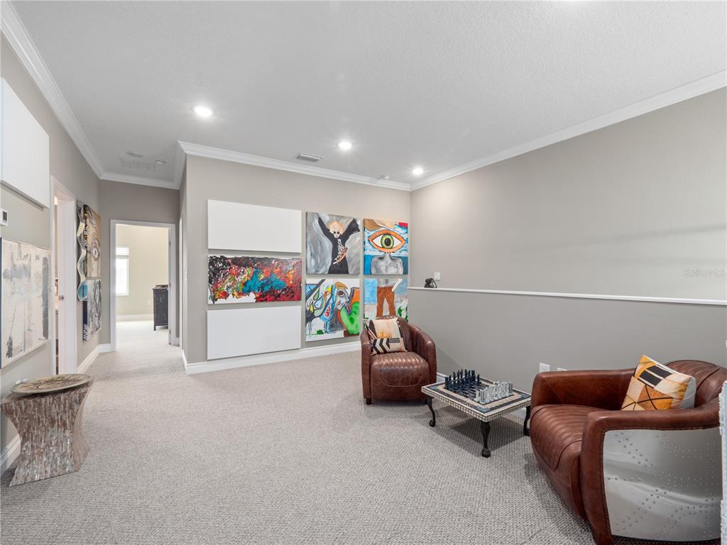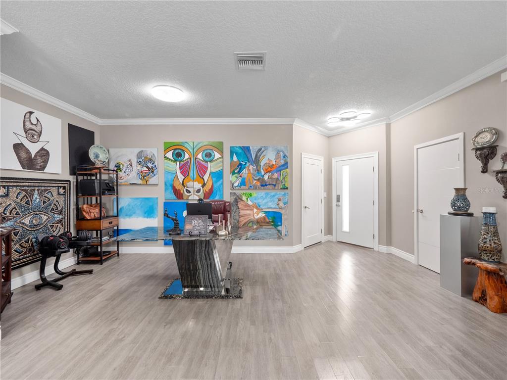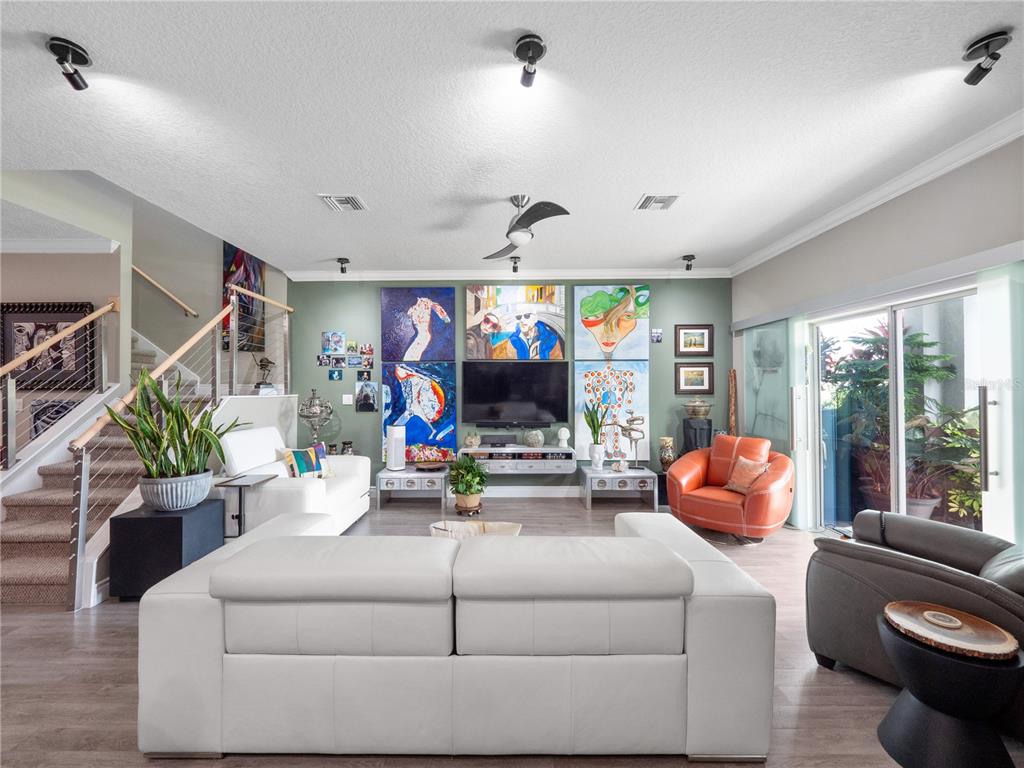 As you arrive, you’re greeted by a concrete and travertine driveway leading to a 2-car garage with frosted glass doors and an automatic opener. Inside, enjoy 9.5-foot ceilings, 6-inch baseboards, and LVP flooring throughout the spacious, open-concept main level. The living room is bright and airy, with sliding glass doors that open to your private patio overlooking serene golf course and pond views.