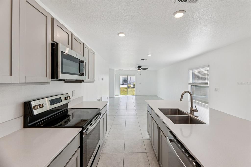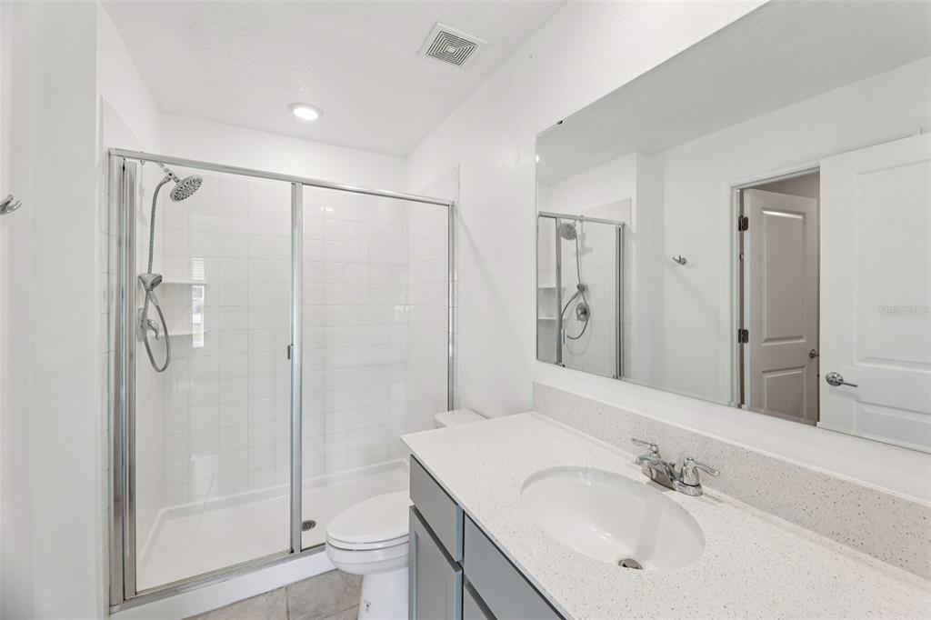 The well-appointed kitchen features a large island, stainless steel appliances, warm gray cabinetry, and ample counter space—perfect for cooking and entertaining. The primary suite includes a generous walk-in closet and an ensuite bathroom with a beautifully tiled shower.