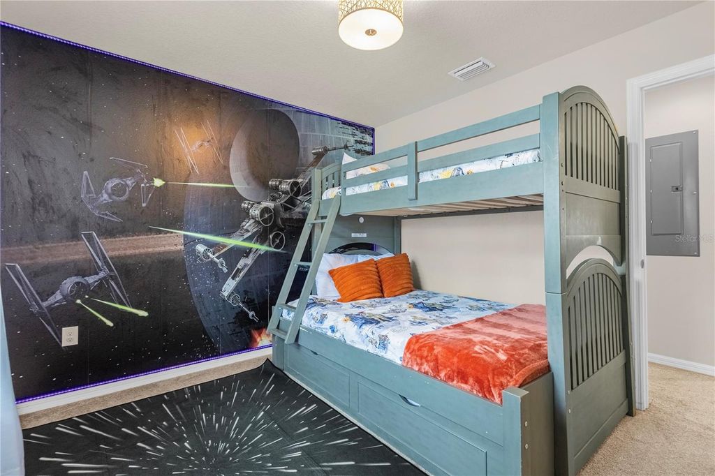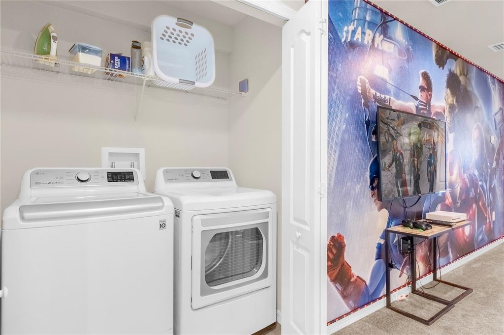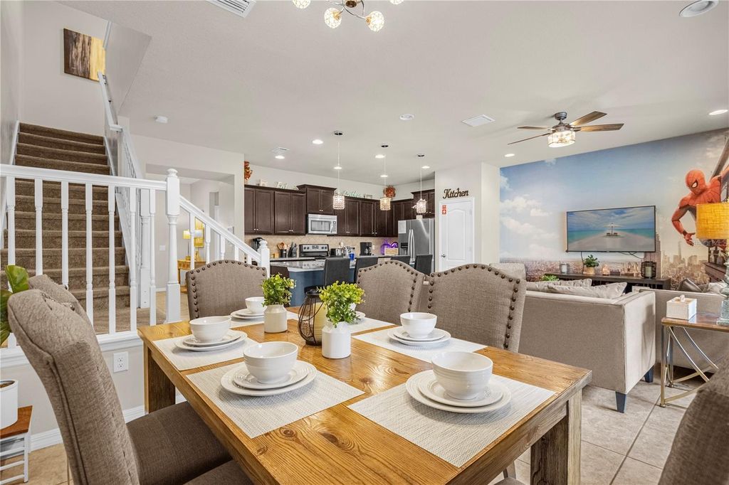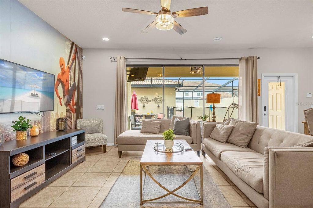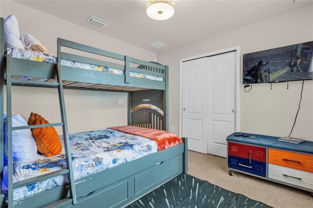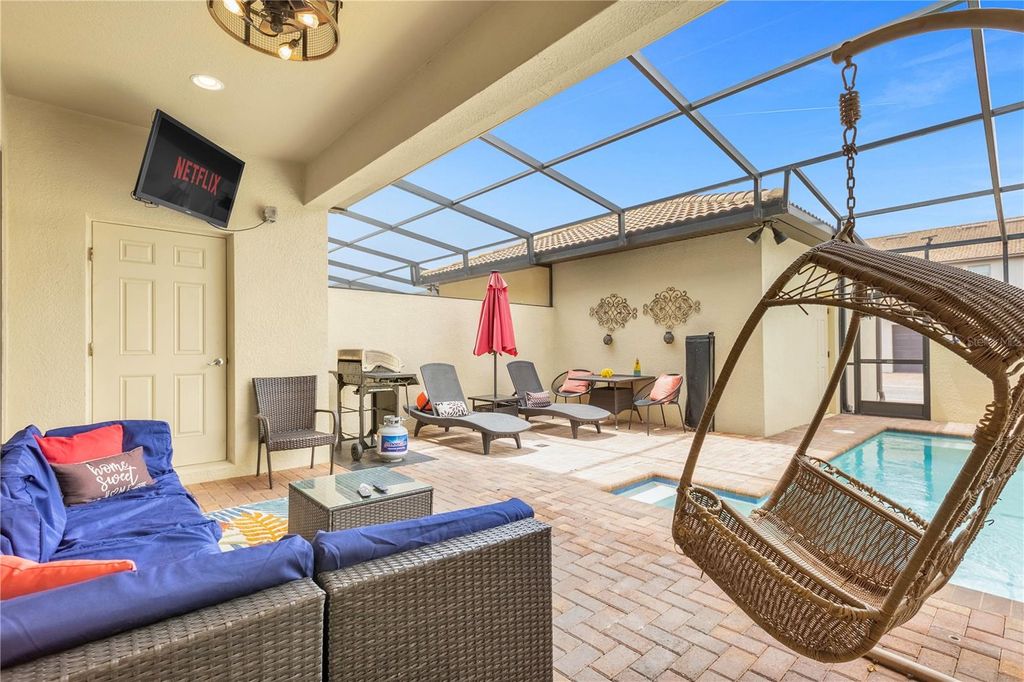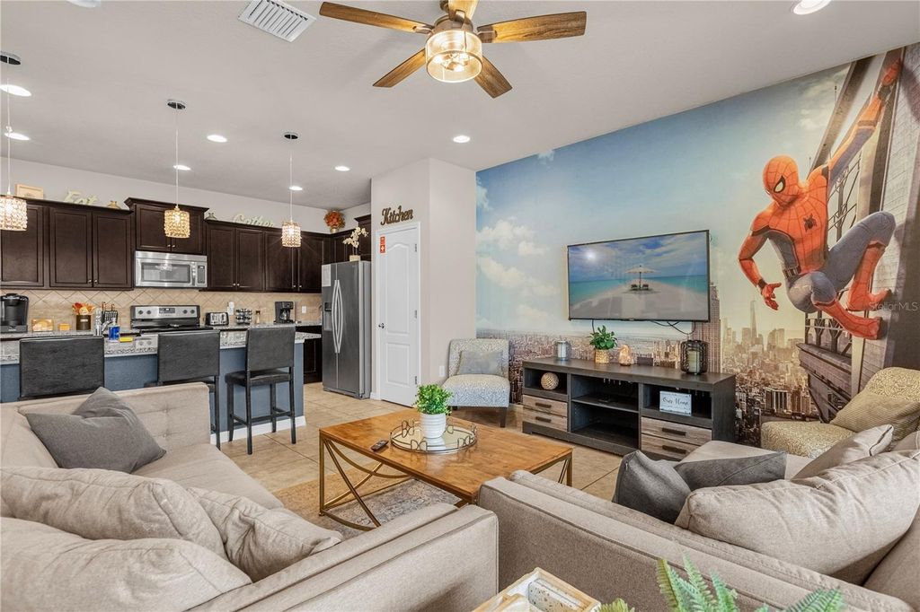 Turnkey Vacation Rental – Leased Through July 2026! This fully furnished, 5-bedroom, 4.5-bathroom vacation retreat is built for both relaxation and revenue””comfortably accommodating up to 16 guests and already leased through May 2026 for instant cash flow! Ideally located just minutes from major theme parks, this property blends modern luxury with fun-filled amenities. On the main floor, you’ll find a private king bedroom and full bathroom””perfect for multi-generational stays. The open-concept heart of the home features a stylish kitchen with granite countertops, stainless steel appliances, and a large island, flowing seamlessly into a bright, airy living room with views of the private heated pool. Step outside to a covered lanai and convenient outdoor half bath””ideal for entertaining. Upstairs, a spacious loft adds bonus living space, alongside four additional bedrooms and three full bathrooms. Two themed rooms””Frozen and Star Wars””feature custom murals and LED lighting, offering a magical experience for younger guests. Recent upgrades include fresh interior paint, a Nest thermostat, digital door locks, new lighting, plush carpeting, and high-end washer/dryer units. The detached garage provides flexible space for parking, storage, or a future game room or theater conversion. The HOA covers cable, internet, trash, lawn care, and access to resort-style amenities including a clubhouse, arcade, sports courts, lazy river, splash pad, resort pool, hot tub, gym, and the on-site Tu Casa Tiki Bar. Whether you’re looking for a personal getaway or a high-performing investment, this property delivers on both comfort and potential. Savvy investors, don’t miss this opportunity””schedule your private showing today!