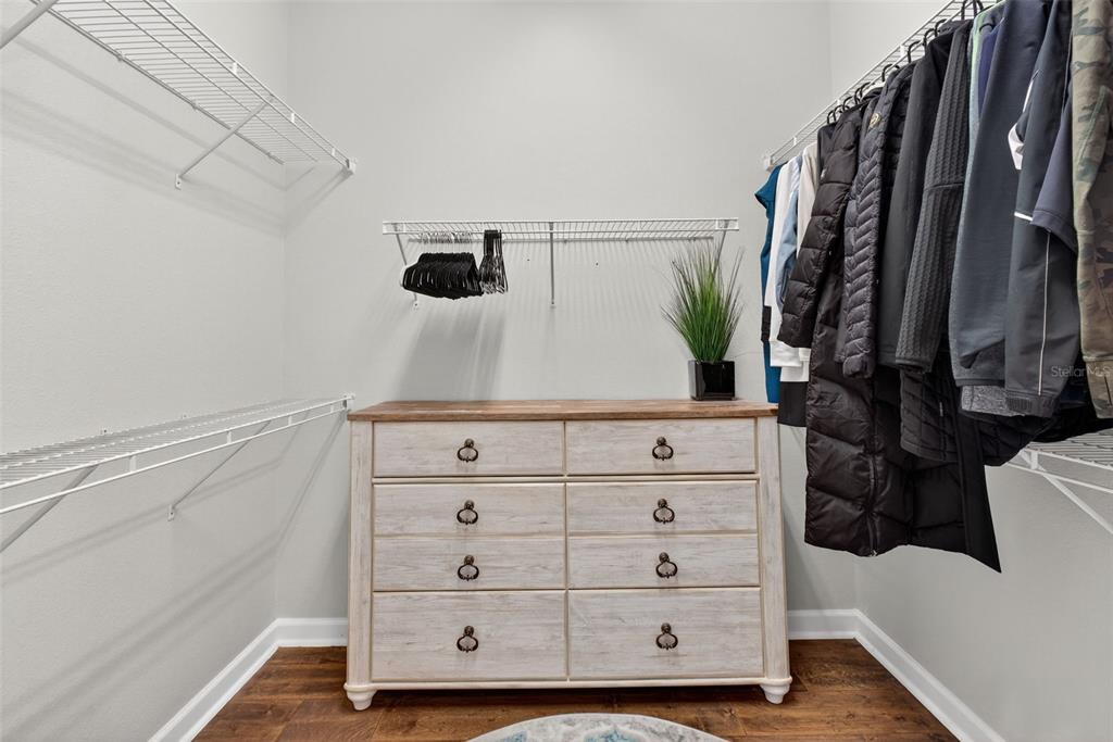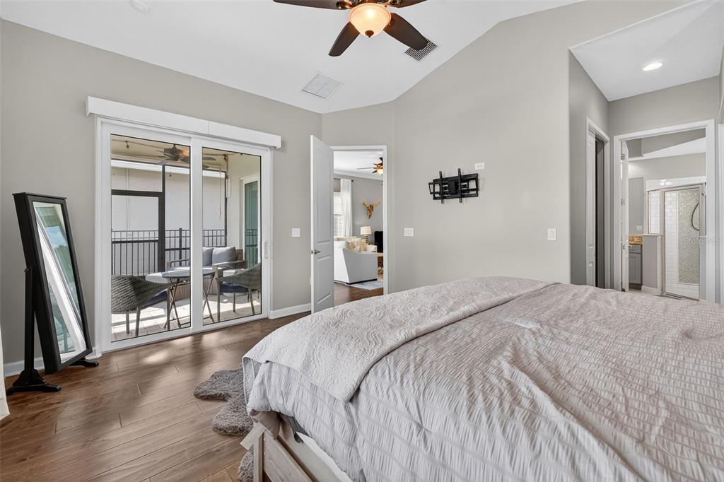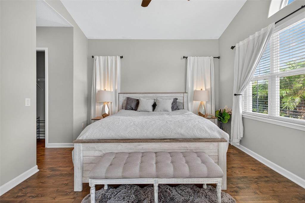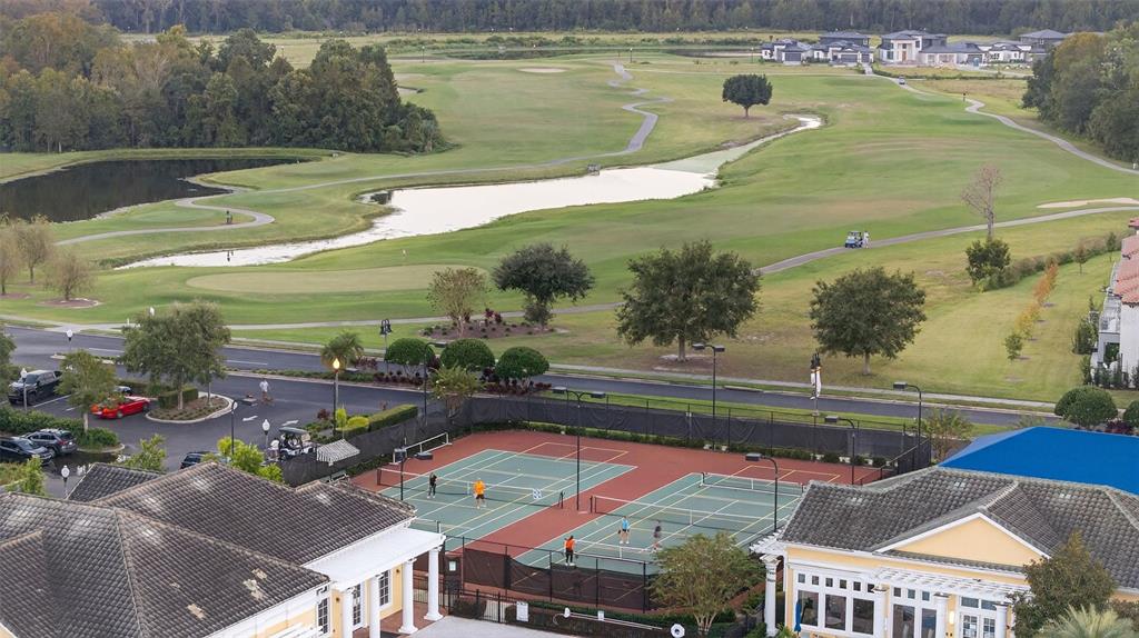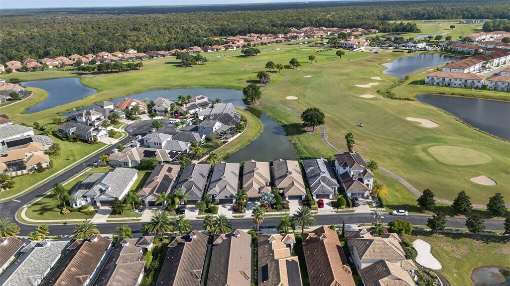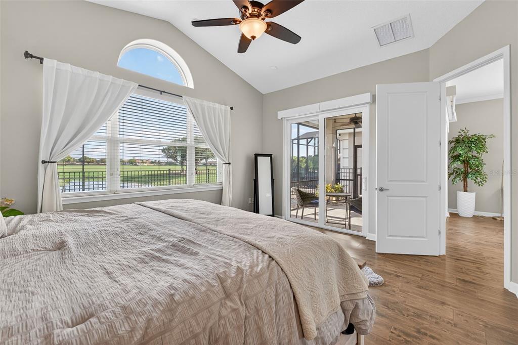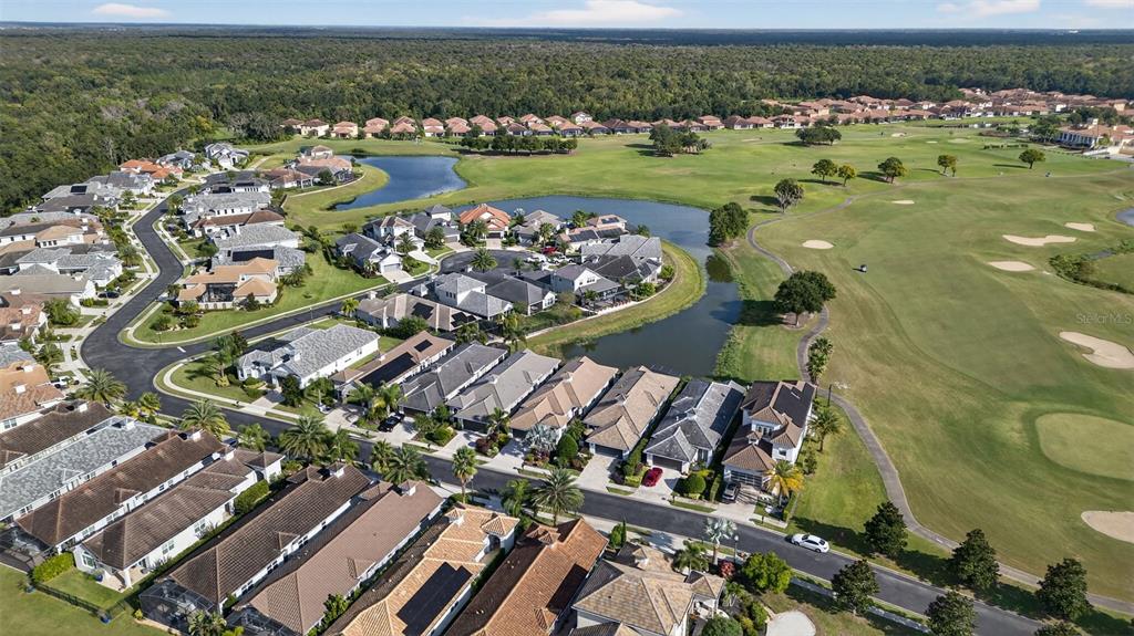 The living room opens to a screened lanai through large bi-fold doors, creating a seamless indoor-outdoor flow perfect for entertaining or relaxing while taking in the tranquil water and golf views. The primary suite offers private lanai access, vaulted ceilings, and dual closets, including a walk-in, while the ensuite bath features double sinks, a soaking tub, and a separate shower.