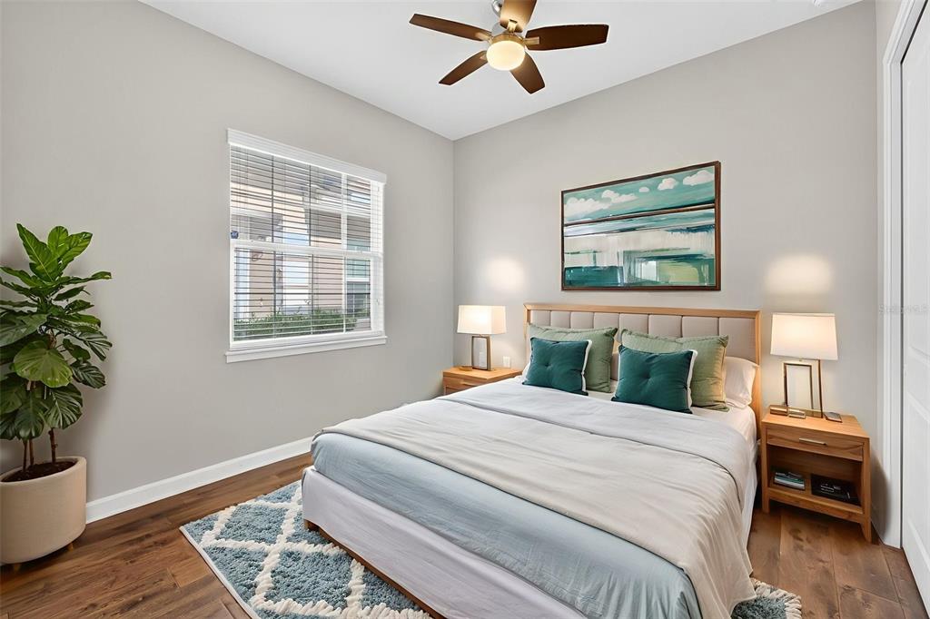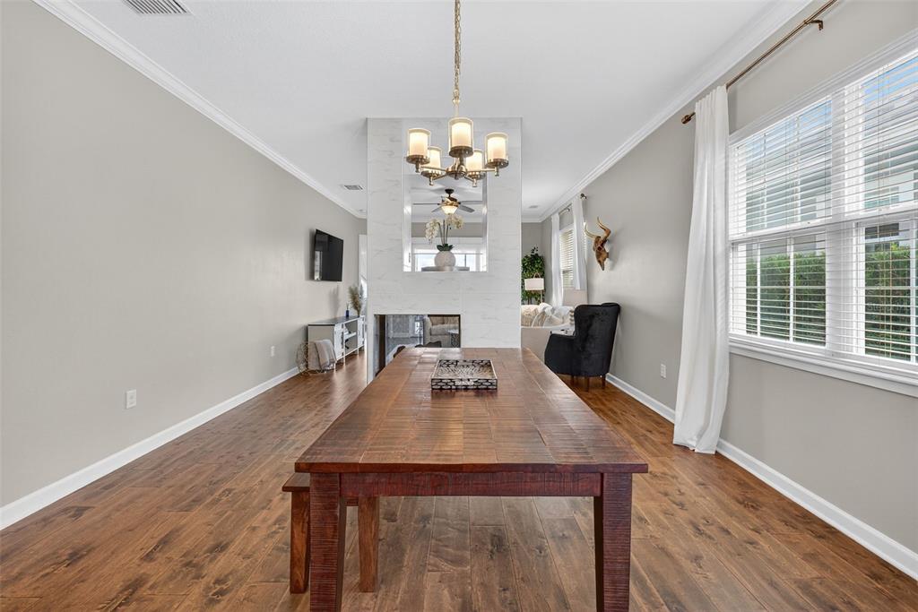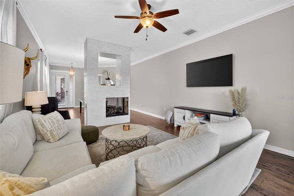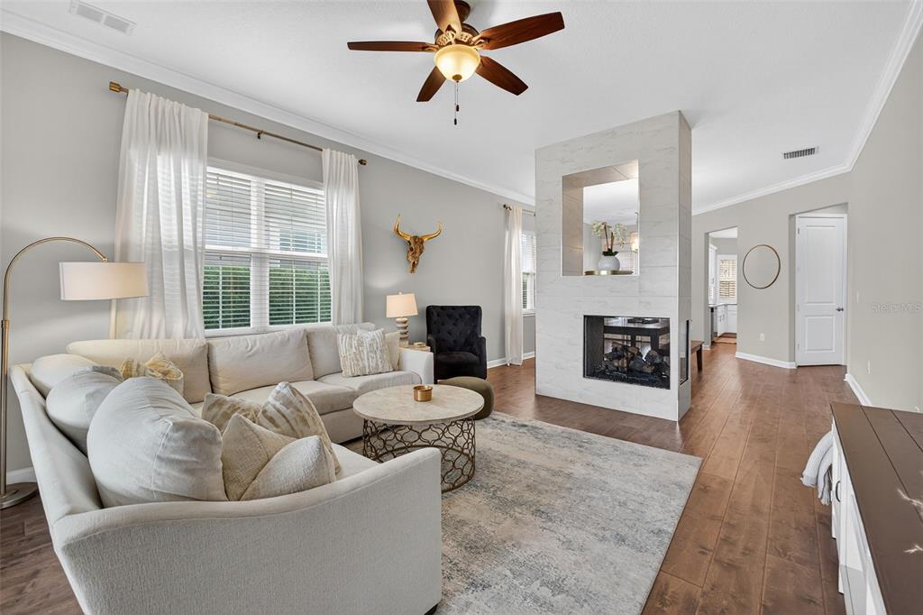 From the moment you enter, you’ll notice the fine craftsmanship and thoughtful upgrades throughout. The open layout features high 10-foot ceilings, flooring, and a striking floor-to-ceiling tile fireplace that adds warmth and character to the main living areas. The spacious kitchen is a chef’s delight, complete with 42-inch wood cabinets with crown molding, granite countertops, a stylish subway tile backsplash, and a comfortable breakfast nook with plantation shutters.