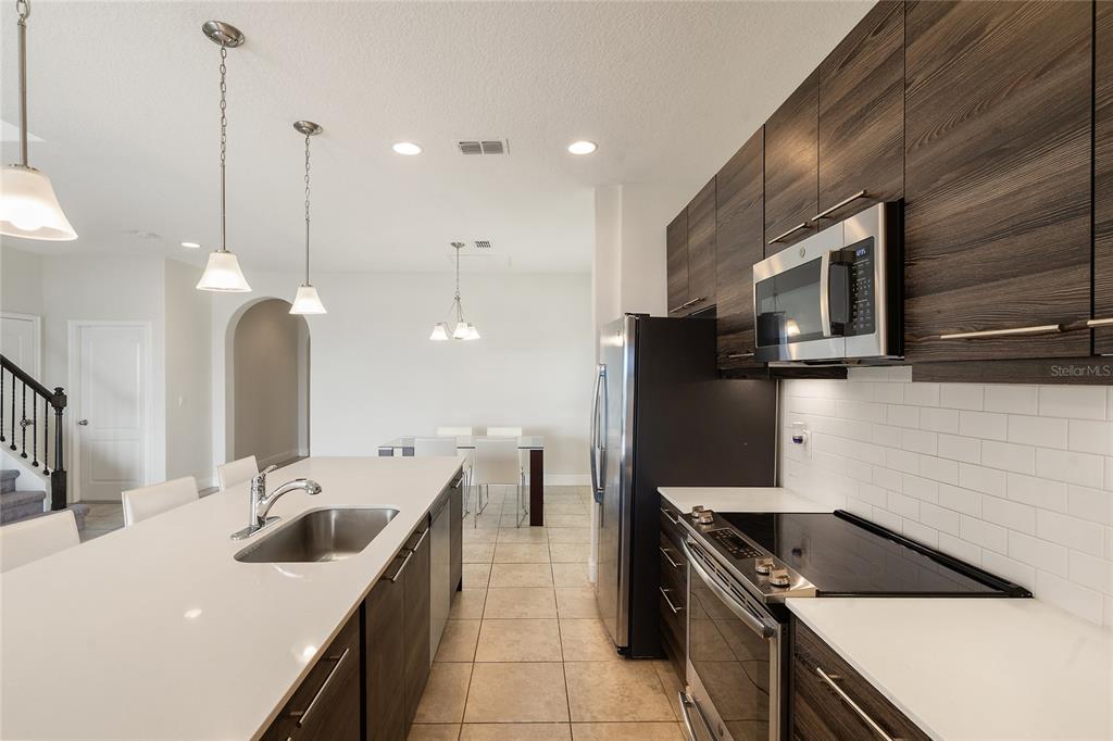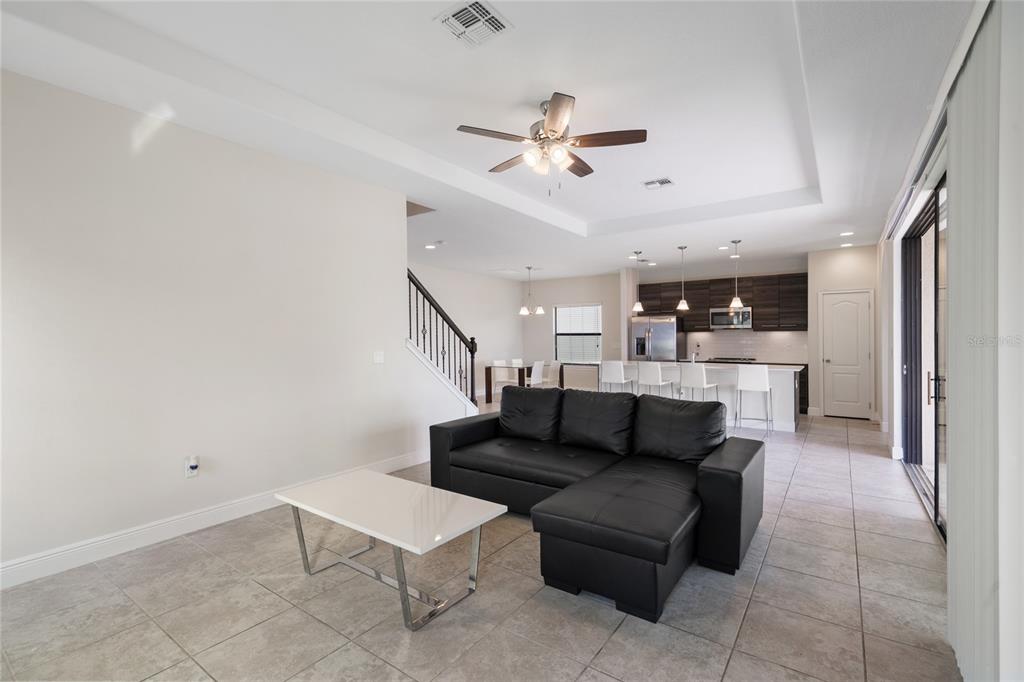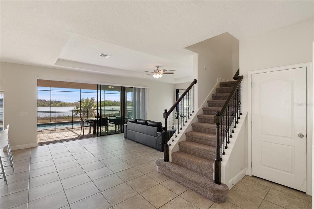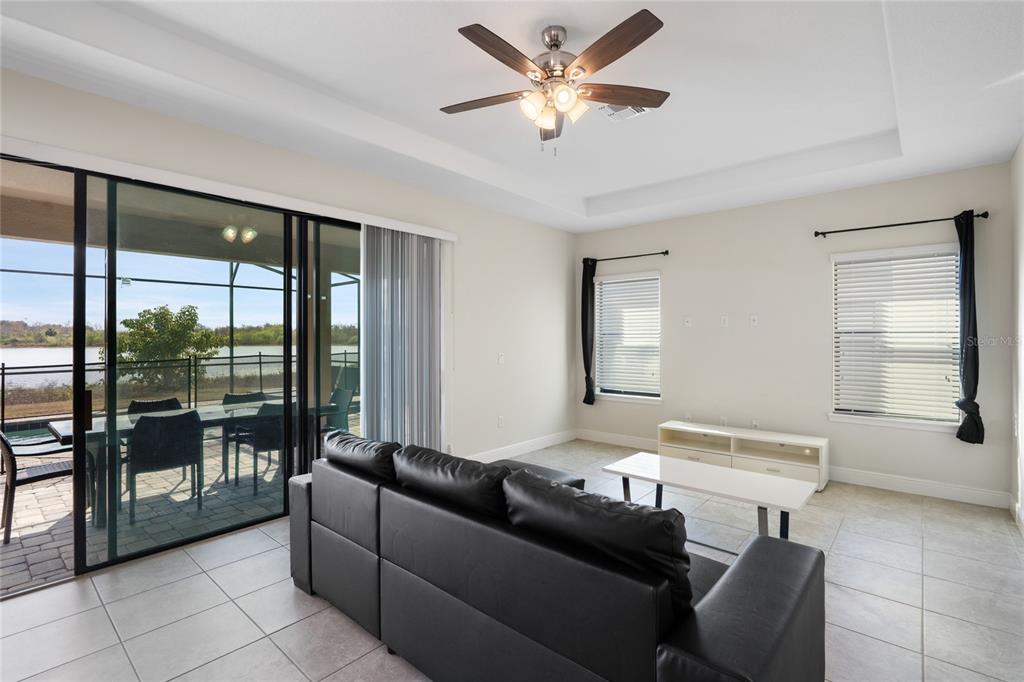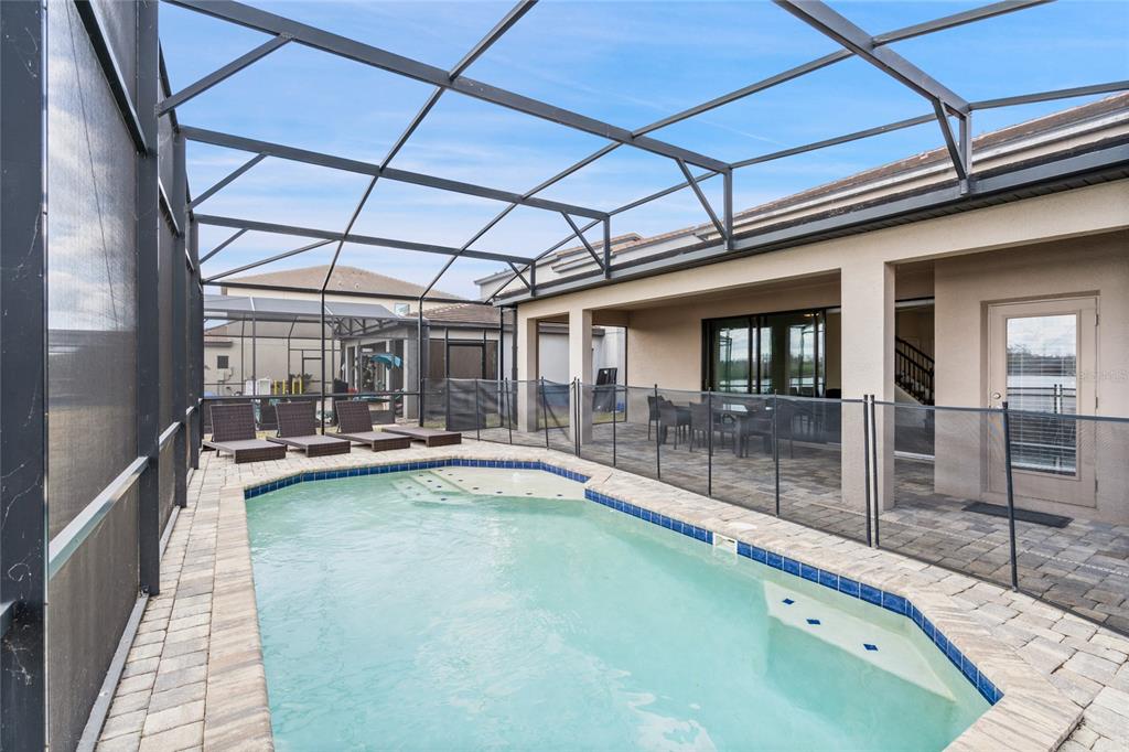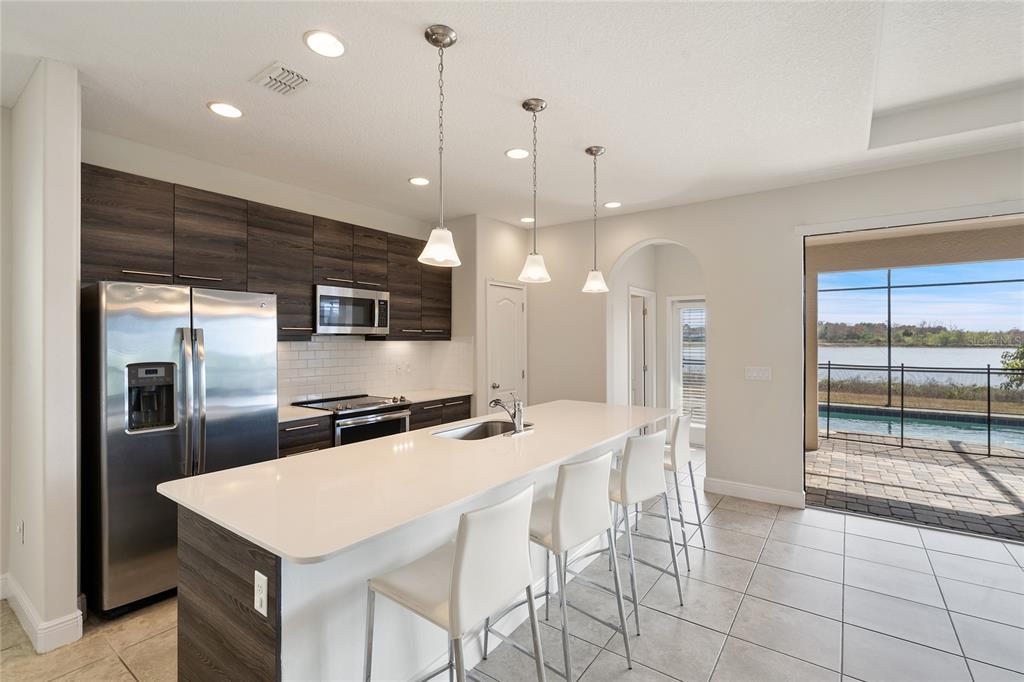 This turnkey short-term rental features an open-concept layout with approximately 2,400 sq. ft., a modern kitchen with quartz countertops, large island, and stainless steel appliances, and fresh interior paint throughout. Triple sliding glass doors open to a covered lanai and private screened-in pool overlooking the lake—one of the most sought-after features for vacation renters.