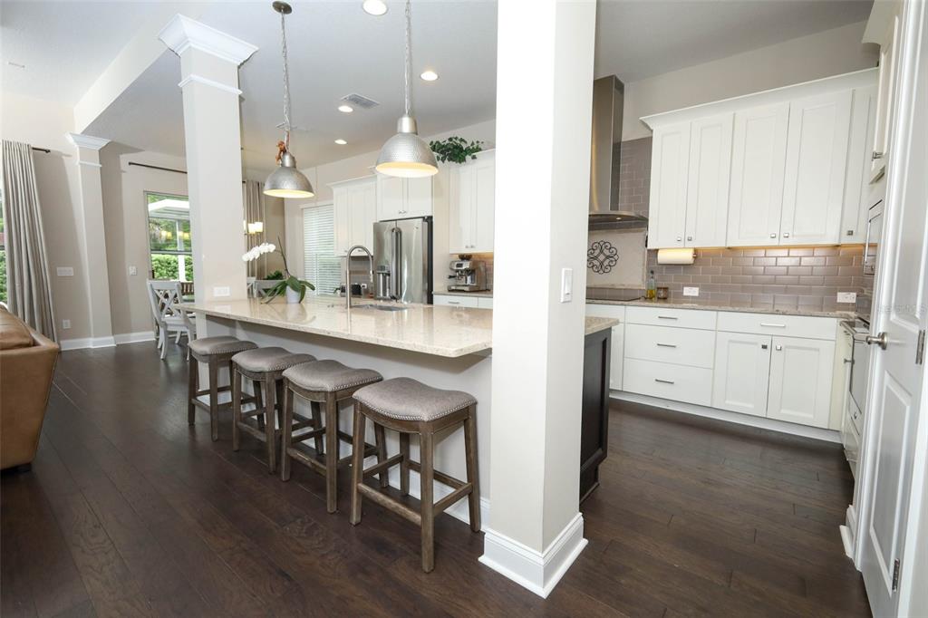 A rare David Weekley spot-built residence in the heart of established Oviedo blends timeless charm, thoughtful design, and a truly resort-inspired outdoor experience. From the welcoming front porch and elongated paver driveway, the home opens to a beautifully finished interior with rich wood flooring, crown molding, soaring ceilings, and a floorplan that lives with both elegance and ease. A versatile front flex room behind French doors offers the perfect setting for a private study, library, or formal sitting room, while the dining space and expansive open-concept living areas create an effortless flow for entertaining. The kitchen is both refined and functional, anchored by an oversized island, solid surface countertops, abundant cabinetry, stainless steel appliances, and a seamless connection to the cafe area and family room.