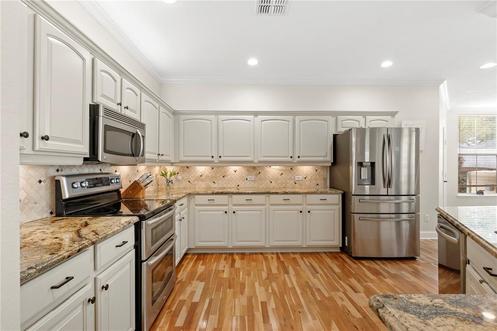 The kitchen was remodeled in 2010 and still holds up with granite countertops, updated appliances including a 2020 refrigerator, convection double oven, and a wine fridge built in bar area that stays. There’s also an under-sink water purification system already in place. Laundry is handled with a 2017 washer and dryer that convey.