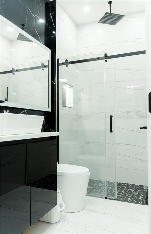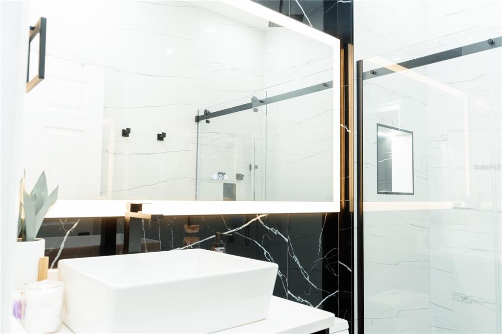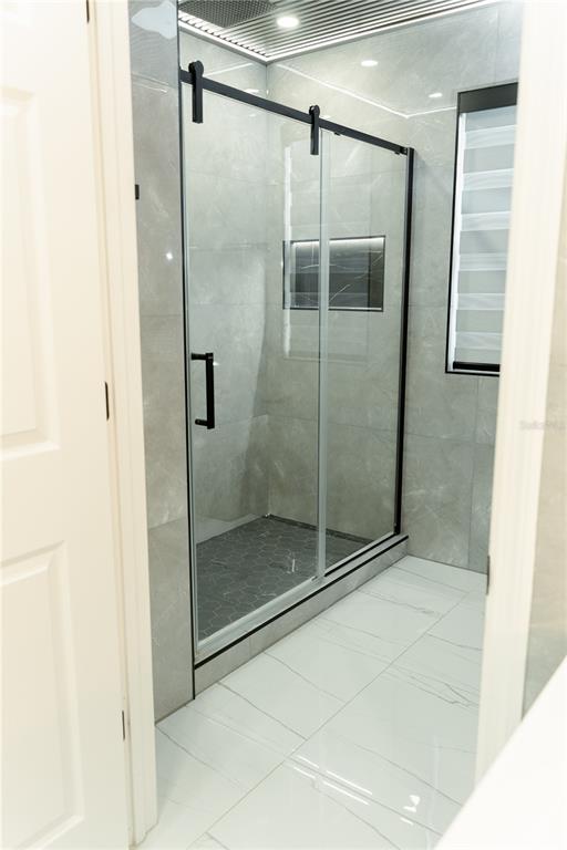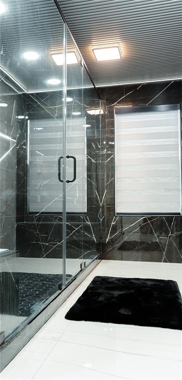Primary suite with custom walk-in closets and a spa-inspired bathroom featuring a rainfall shower