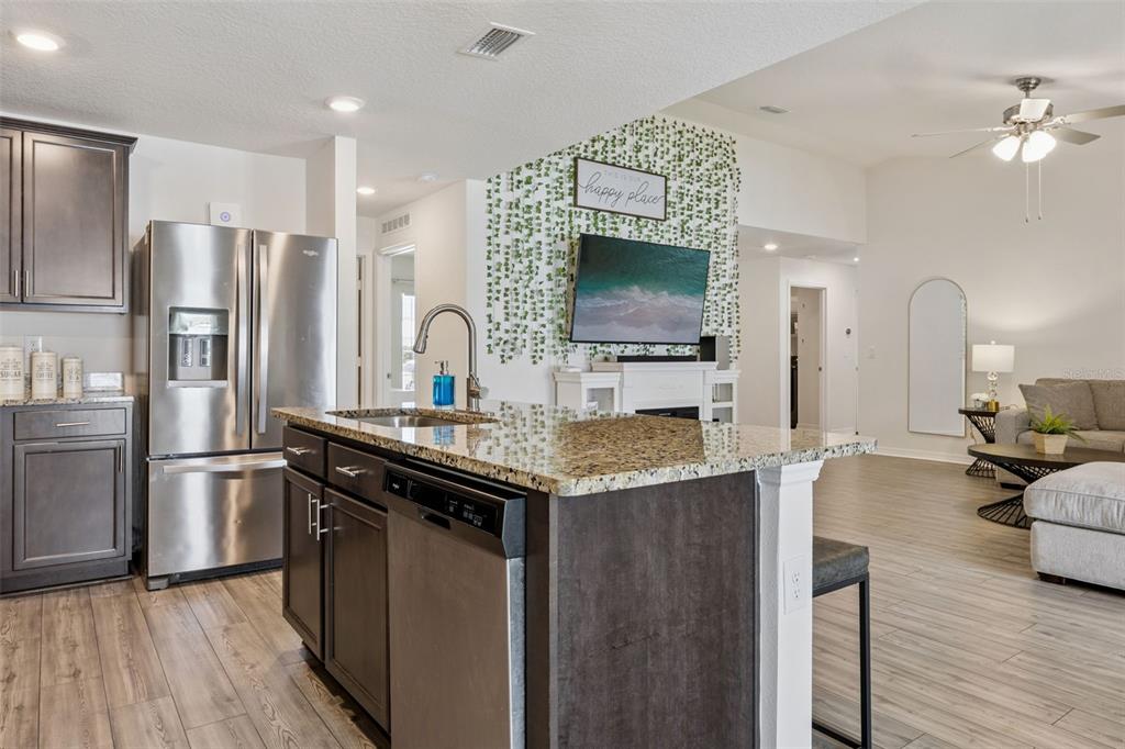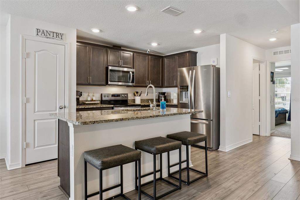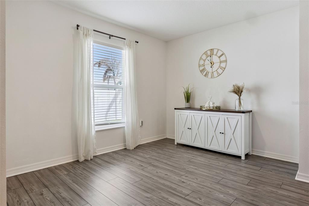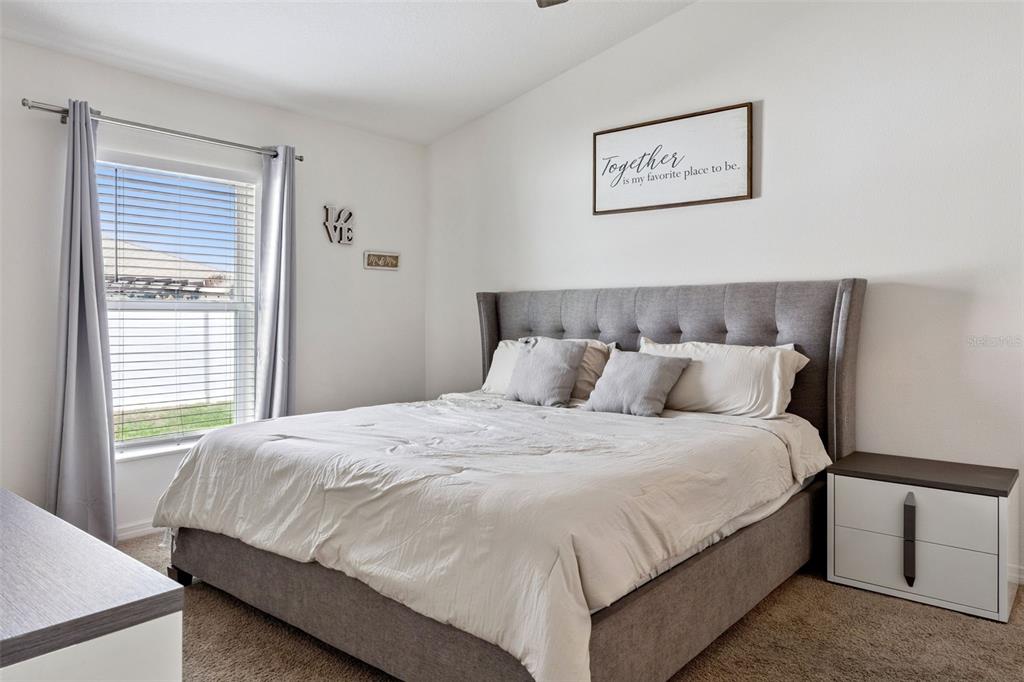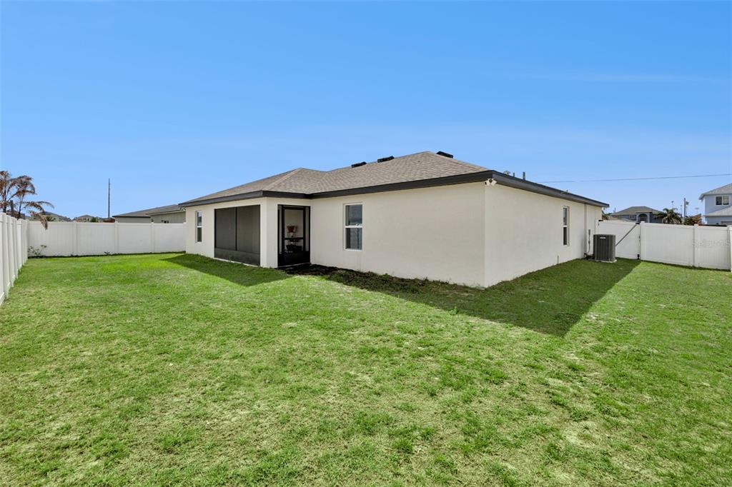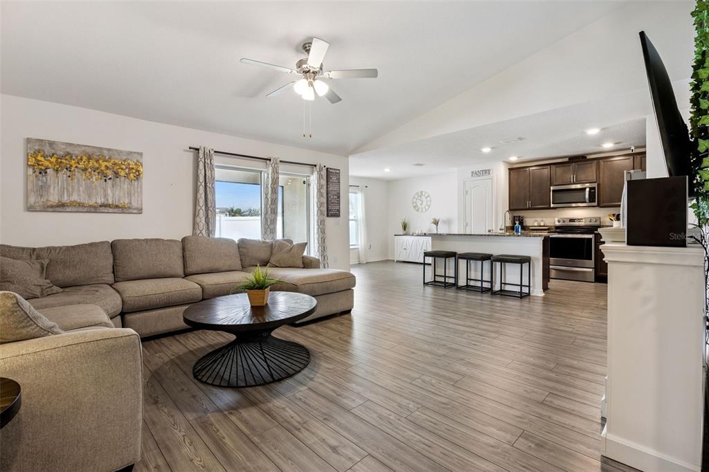 Welcome home to this beautifully designed one-story residence offering the perfect blend of comfort and flexibility with 3 bedrooms plus a versatile flex room that can easily be converted into a 4th bedroom. Step inside to an open and inviting floorplan where luxury vinyl plank flooring flows throughout the main living areas, creating a seamless and modern feel. The kitchen serves as the heart of the home, featuring granite countertops, abundant cabinetry, a spacious pantry, and a counter-height island with seating that overlooks the expansive living and dining areas, ideal for both everyday living and entertaining. Thoughtfully designed with a split bedroom layout, the primary suite and flex room are privately positioned away from the secondary bedrooms, offering added privacy and endless possibilities for how the space can be used, whether as a home office, playroom, fitness area, or guest room. The primary suite offers a relaxing retreat with a large en-suite bath complete with a double sink vanity, quartz countertops, and a walk-in shower. Secondary bedrooms are well-sized and thoughtfully positioned, while the additional bathroom also showcases quartz countertops for a cohesive, upgraded look. Enjoy indoor-outdoor living with sliding glass doors leading to a screened lanai and a fully fenced backyard offering added flexibility with gate access on both sides, including a double gate entry. Additional highlights include a spacious laundry room, a two-car garage, and a welcoming covered front entry. Located in the Poinciana area, residents enjoy access to a variety of community amenities including parks, playgrounds, sports courts, fitness centers, and recreational facilities, along with nearby shopping, dining, and everyday conveniences, making this home an ideal blend of comfort and lifestyle.