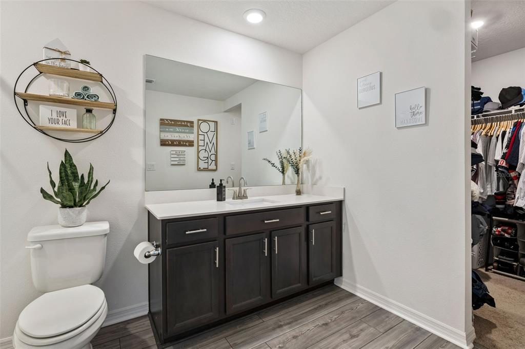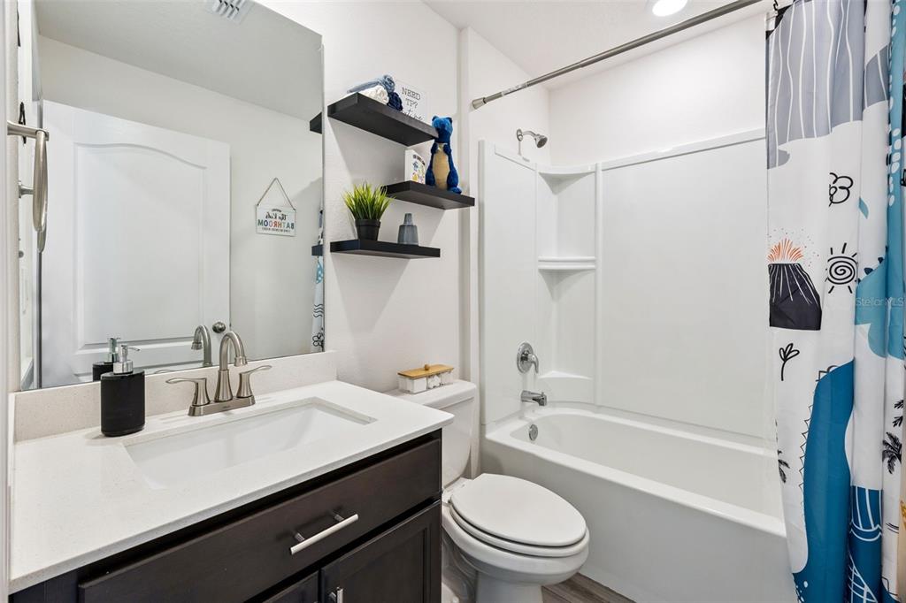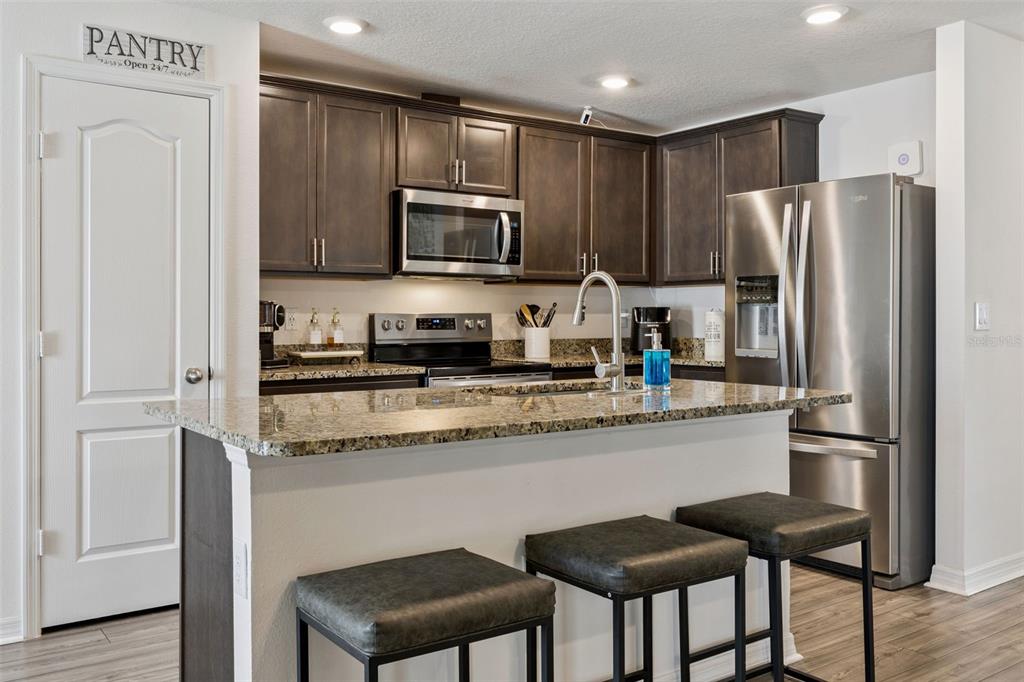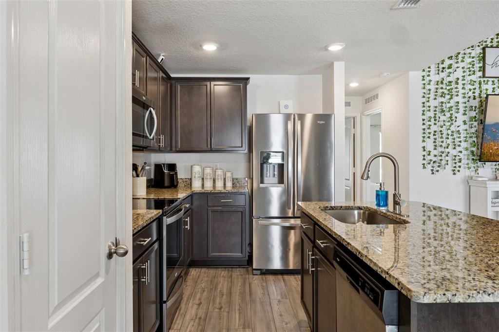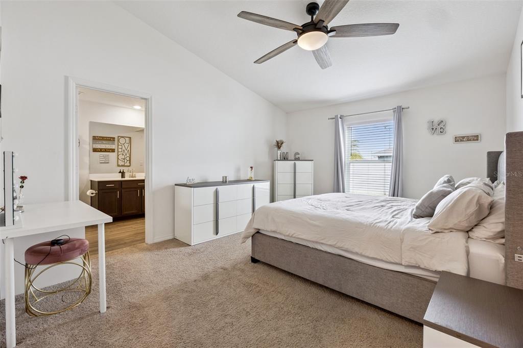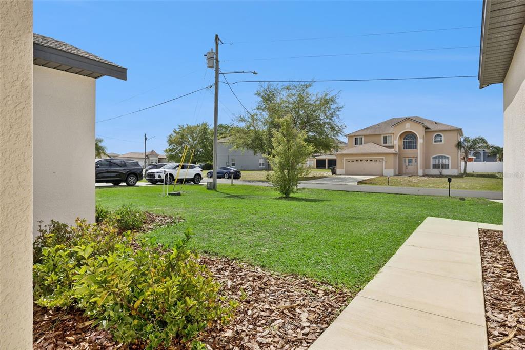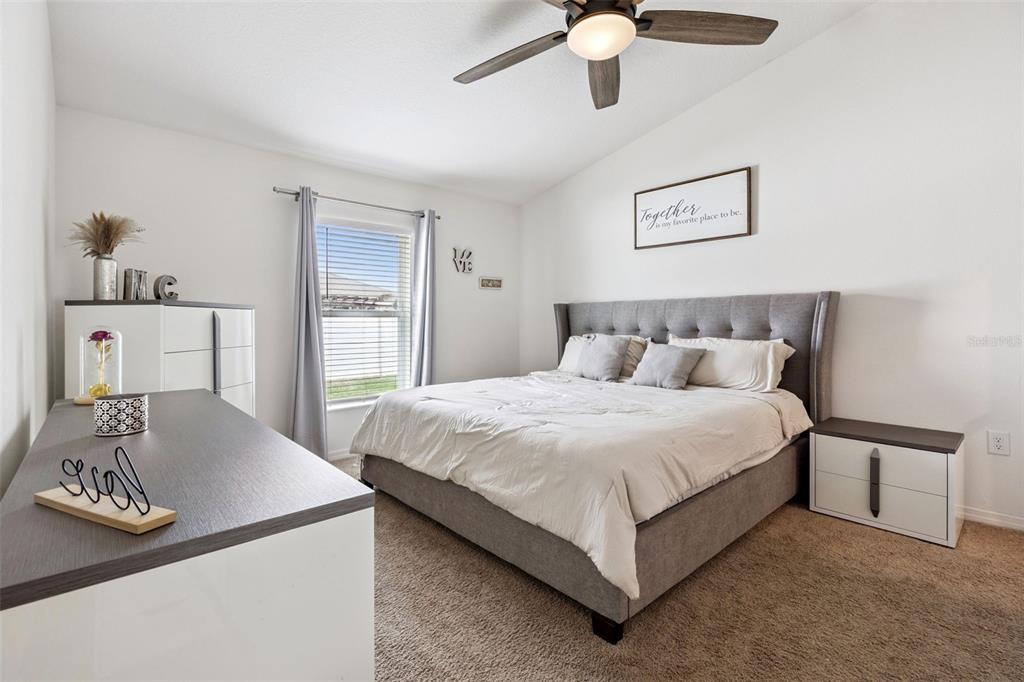 Welcome home to this beautifully designed one-story residence offering the perfect blend of comfort and flexibility with 3 bedrooms plus a versatile flex room that can easily be converted into a 4th bedroom. Step inside to an open and inviting floorplan where luxury vinyl plank flooring flows throughout the main living areas, creating a seamless and modern feel. The kitchen serves as the heart of the home, featuring granite countertops, abundant cabinetry, a spacious pantry, and a counter-height island with seating that overlooks the expansive living and dining areas, ideal for both everyday living and entertaining. Thoughtfully designed with a split bedroom layout, the primary suite and flex room are privately positioned away from the secondary bedrooms, offering added privacy and endless possibilities for how the space can be used, whether as a home office, playroom, fitness area, or guest room. The primary suite offers a relaxing retreat with a large en-suite bath complete with a double sink vanity, quartz countertops, and a walk-in shower. Secondary bedrooms are well-sized and thoughtfully positioned, while the additional bathroom also showcases quartz countertops for a cohesive, upgraded look. Enjoy indoor-outdoor living with sliding glass doors leading to a screened lanai and a fully fenced backyard offering added flexibility with gate access on both sides, including a double gate entry. Additional highlights include a spacious laundry room, a two-car garage, and a welcoming covered front entry. Located in the Poinciana area, residents enjoy access to a variety of community amenities including parks, playgrounds, sports courts, fitness centers, and recreational facilities, along with nearby shopping, dining, and everyday conveniences, making this home an ideal blend of comfort and lifestyle.