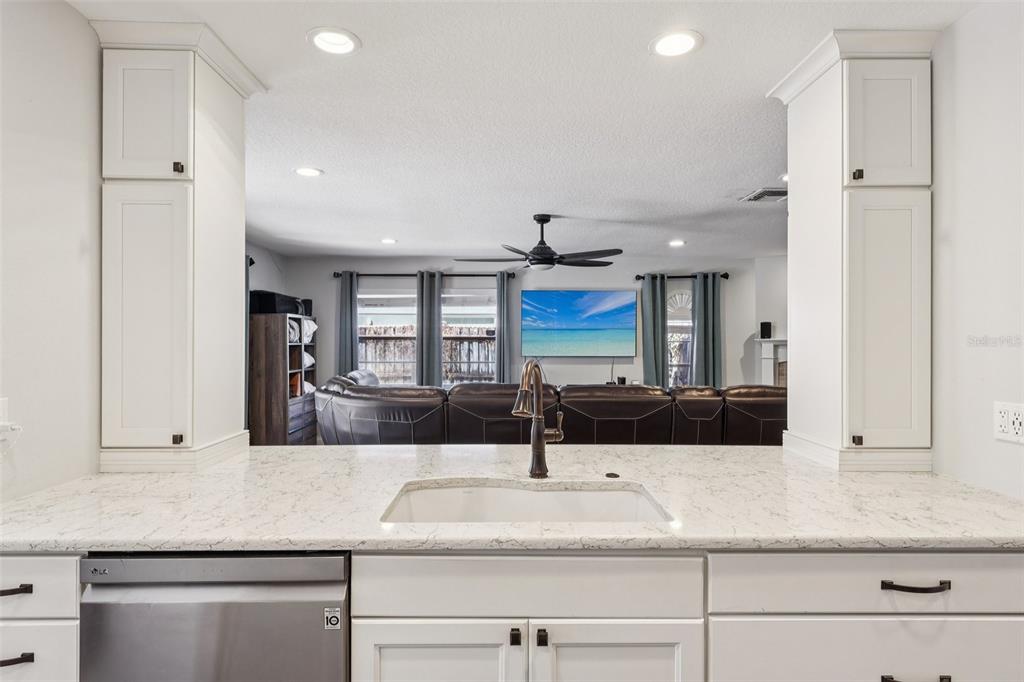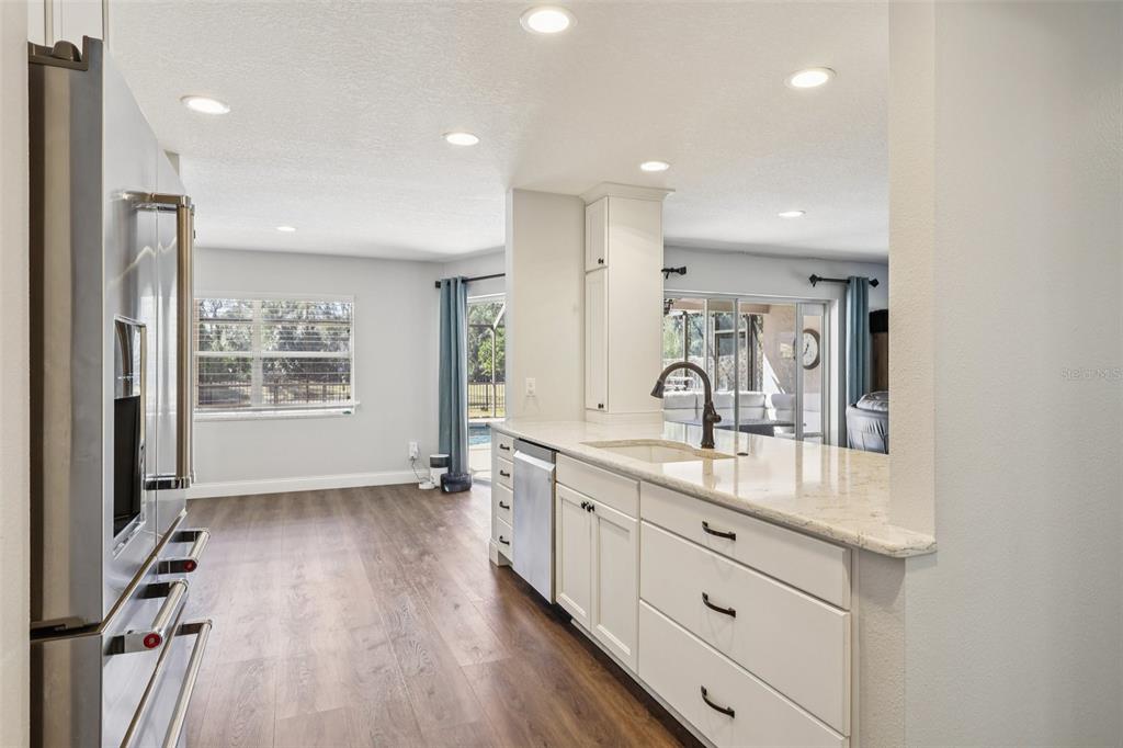 Step through the double-door entry into soaring ceilings and light-filled living and dining spaces. The renovated kitchen features quartz countertops, a wine cooler, coffee bar, breakfast nook, and overlooks the spacious family room with a wood-burning fireplace. Sliding doors open to the screened lanai and private saltwater pool, creating seamless indoor-outdoor living.