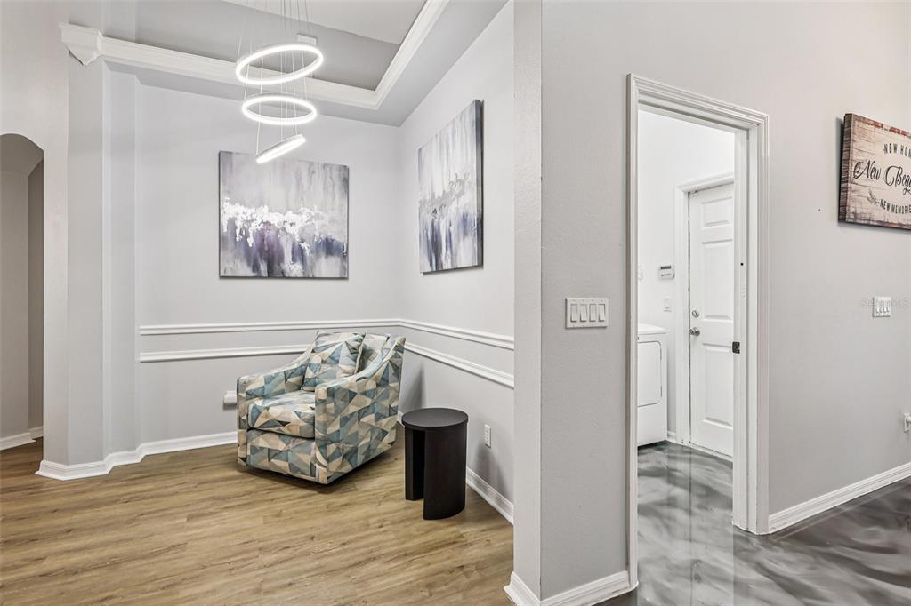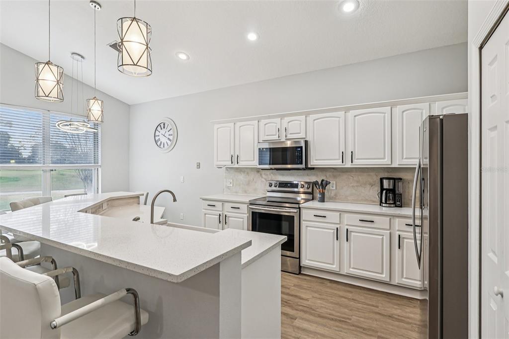Step inside this stunning single-family home and be greeted by an open floor plan with soaring cathedral ceilings and elegant laminated floors throughout. The foyer welcomes you with a stylish epoxy floor, setting the tone for the modern elegance found throughout the home.