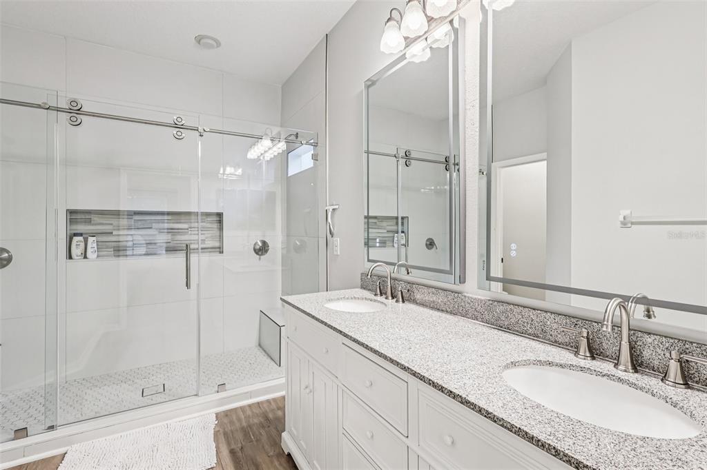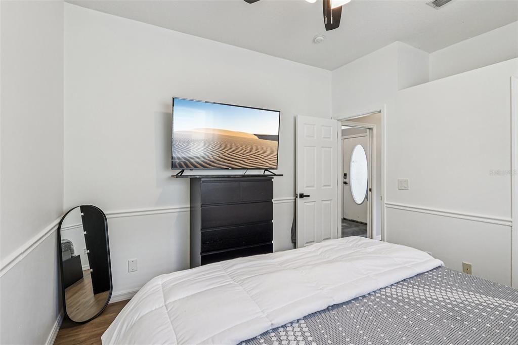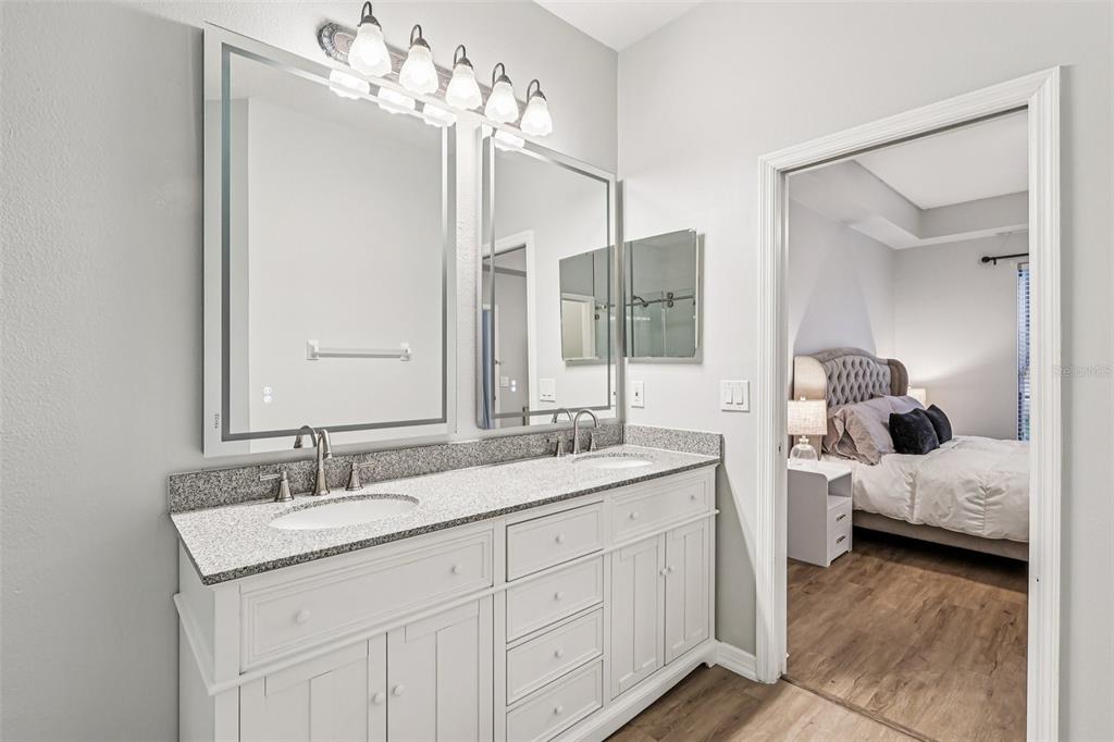 The main bedroom offers a private retreat with its own en-suite bath, while the additional three bedrooms are perfectly arranged: two in a convenient Jack-and-Jill style with a pocket door, and another on the opposite side of the home for extra flexibility—ideal for guests or a home office.