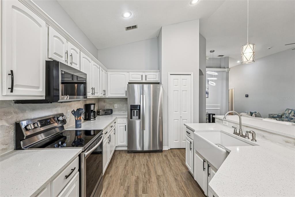 At the heart of the house, you’ll find an updated gourmet kitchen featuring a thoughtful design layout, quartz countertops, stainless steel appliances, and a brand-new dishwasher to make hosting a delight. Gather around the linear fireplace in the living area for cozy evenings at home.