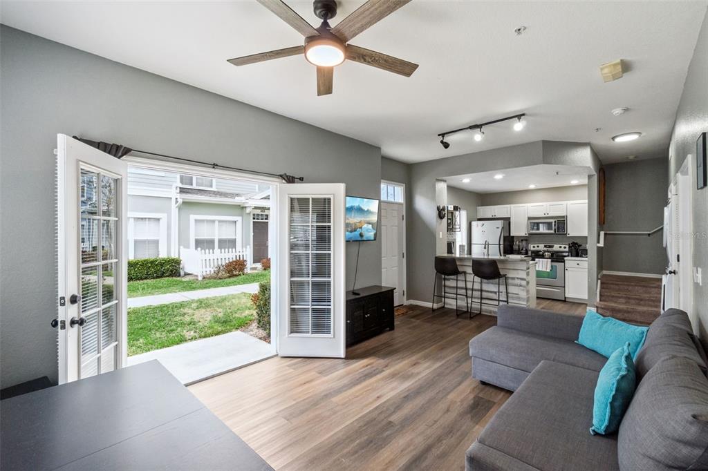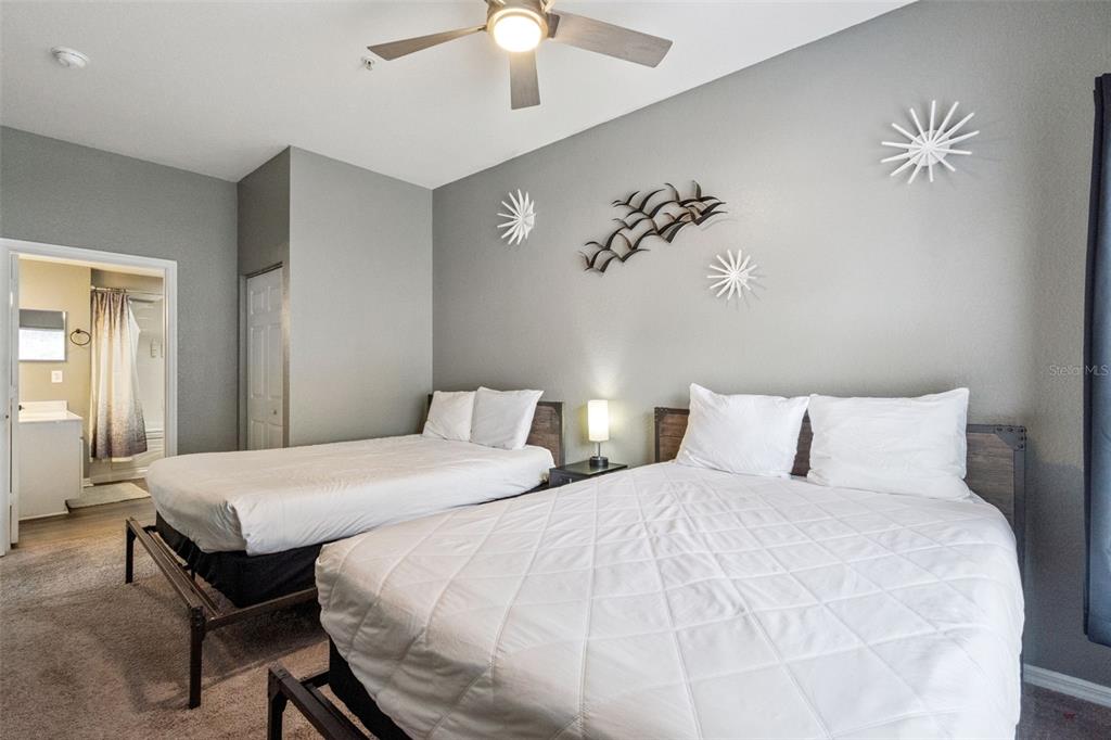 The home features a spacious open living and dining area, a fully equipped kitchen, and a private porch just off the living room—perfect for relaxing after a day enjoying Central Florida’s attractions. The primary bedroom with en-suite bath is conveniently located on the first floor, while the second level offers additional bedrooms, including one bedroom with its own en-suite bathroom, providing comfort and privacy for guests and family.
