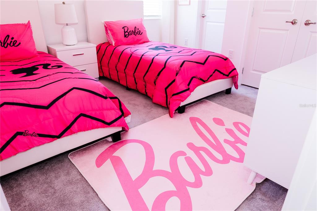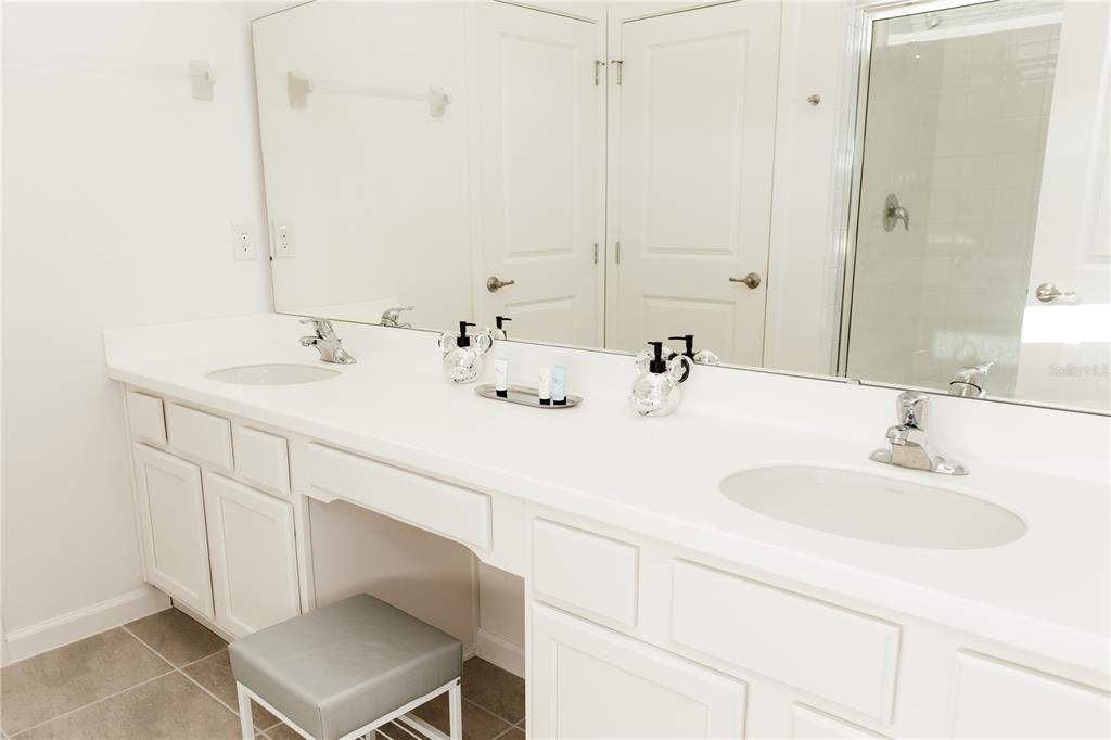 The home offers two primary suites, one on the first floor and one on the second, along with multiple additional bedrooms and a large loft/bonus area. A secondary bedroom on the first floor includes en-suite bath access with convenient entry from the hallway and pool area.