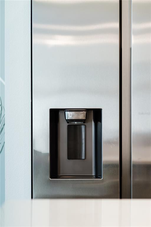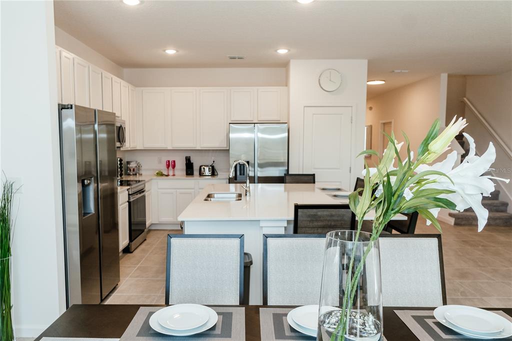 The kitchen includes an oversized island with stone countertops and bar seating, stainless steel appliances, two refrigerators, two dishwashers, recessed lighting, and a pantry for additional storage. Sliding glass doors provide seamless indoor-outdoor access to the pool deck.
