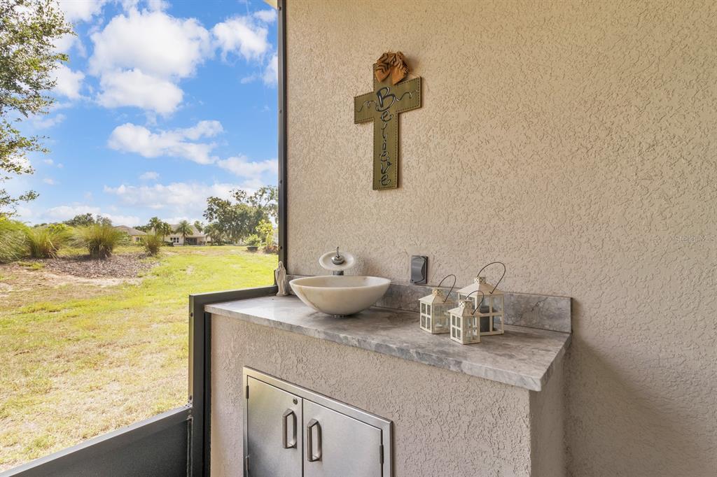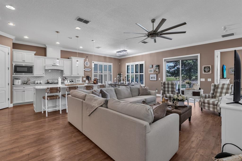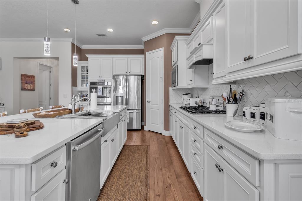 Must see this like new home the “St Thomas” model built by K. Hovnanian’s, this home features many upgrades and is located right on the golf course at Four Seasons at Orlando, one of Central Florida newest and most desirable 55+ communities. Enter and appreciate the Grand Foyer it’s very warm and inviting with the architectural design on tray ceiling, beautiful flooring which makes it’s way into the open floorplan of the kitchen and living area. You will find crown molding throughout the main living area and plantation shutters. The kitchen is a chef’s paradise where you will find, blanco maple quartz counter tops, huge island can accommodate up to 6 seats, a 5 burner gas cooktop with decorative vent hood, built in stainless steel GE double convection ovens and refrigerator, stainless steel apron sink and large walk in corner pantry. In the back of the house, you will find the master featuring an incredibly large walk in closet, double sinks, walk in shower featuring beautiful bianco carrrera tiles throughout. The other two rooms are at the front of the house at entry with a shared full bathroom. There is a private office space off the hallway which sellers used to place a small bed. By the garage entry you will find a large laundry room with front load washer and gas dryer, this home also provides a tankless gas water heater for efficiency. The exterior porch area is another entertaining paradise the outdoor kitchen has under counter refrigerator, storage and sink. This home is perfect for active adult lifestyle, with beautiful Club house, fitness center, pools, tennis courts, pickle ball courts and much more. Located near all the mayor park attractions such as Disney Parks and Resorts. The community is gated and manned by security 24/7.