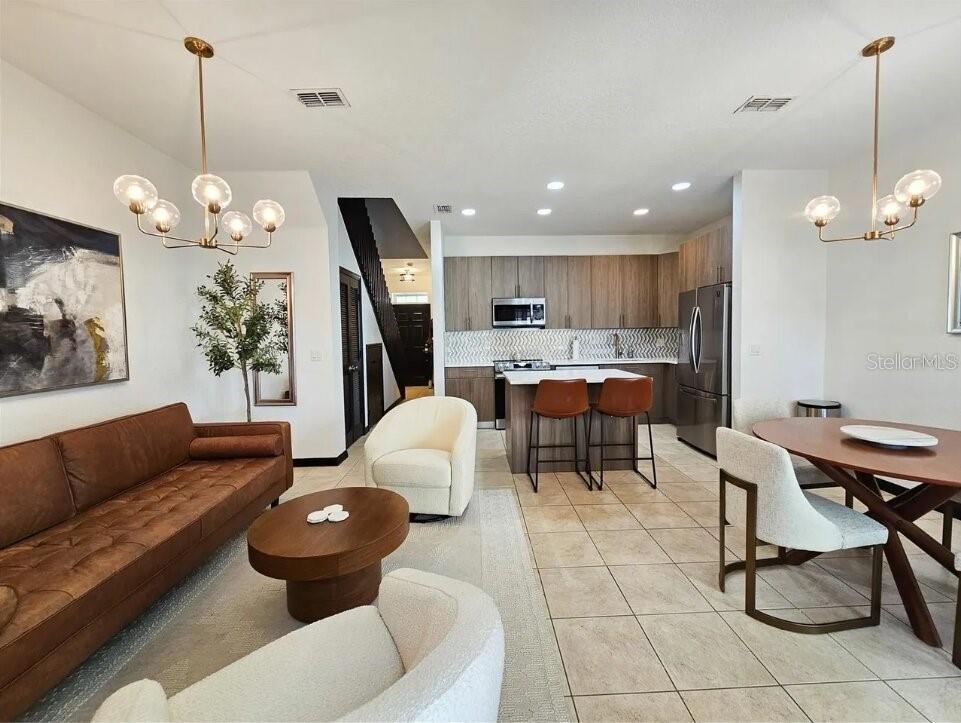 Amazing opportunity to own this immaculate, MOVE-IN READY home. Fully furnished all new. Come and see for yourself. Whether you are looking for a home to live in it full time, vacation getaway, short term rental, this luxury 4-bedroom 3 full bath is ready for you! First floor offers a brand-new kitchen cabinet, island, new stainless-steel appliances and freshly painted throughout the home. Dining and living room combo, a king size bedroom, full bathroom, and a laundry closet with stackable washer & dryer, also has a screened patio with lake view. The second floor has a master king bedroom with private bathroom, bedroom #3 with a queen and Bedroom #4 with a bunk bed (full + twin) a sharable bath and a loft with television. Great location close to the pool and other great amenities such as playground and fitness center. Check out the desirable gated community of Coral Cay Resort is close to shopping, restaurants, attractions and major roadways. Easy drive to Disney property, Downtown Kissimmee, the Orlando International Airport, and all that Central Florida.
