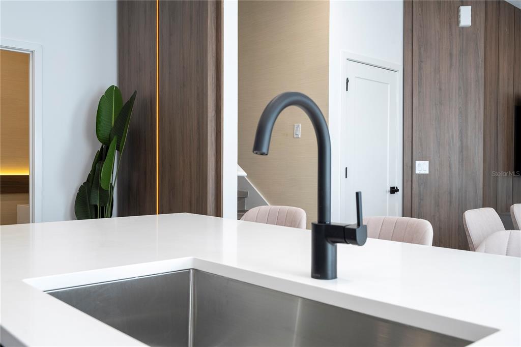 The kitchen is a showstopper with two oversized islands, Level 5 quartz countertops, designer backsplash, slatted wood detail, and Whirlpool stainless steel appliances. All cabinetry throughout the home includes soft-close features and matte hardware for a sleek, modern finish.