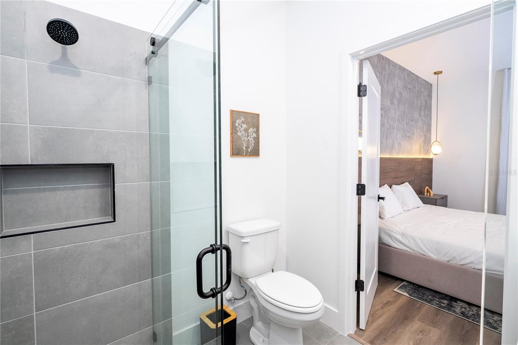 Each of the five bedrooms is designed with comfort and rental flexibility in mind — including four full en-suites and one located on the first floor. The bathrooms are finished with high-end porcelain tile, glass shower enclosures, built-in niches, and vessel sinks in select locations. Luxury vinyl plank flooring runs throughout the entire home — no carpet anywhere — and 5.5″ square baseboards give a clean, elevated look.