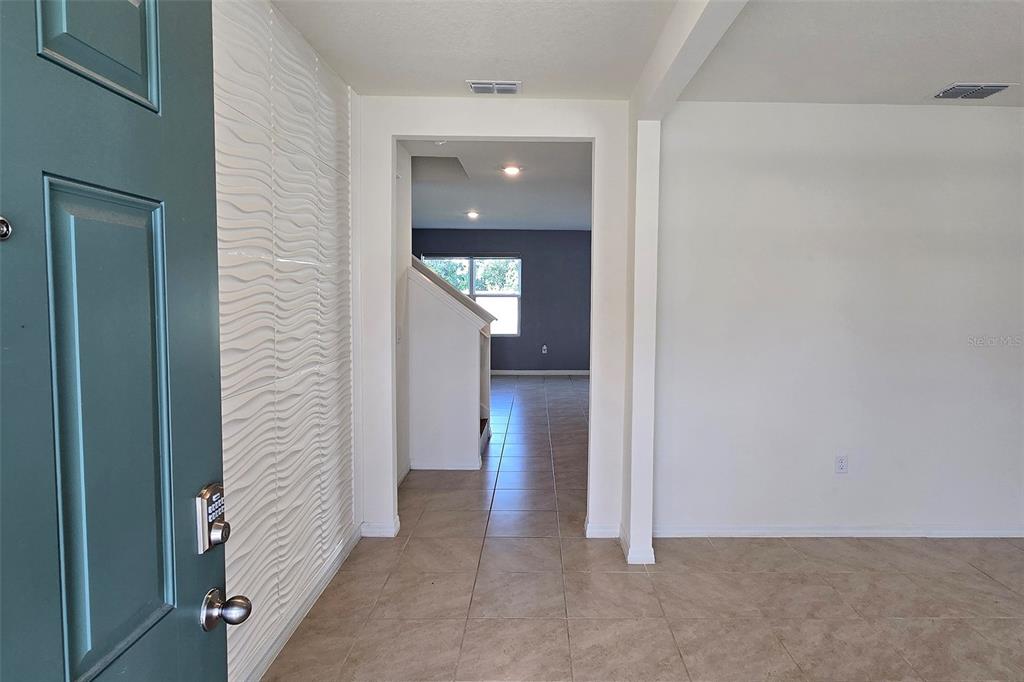 Step inside to find a flexible multi-purpose room at the entrance—perfect for a home office, playroom, or formal sitting area. The open-concept layout leads to a spacious kitchen overlooking the living and dining areas, with sliding doors opening to the backyard.