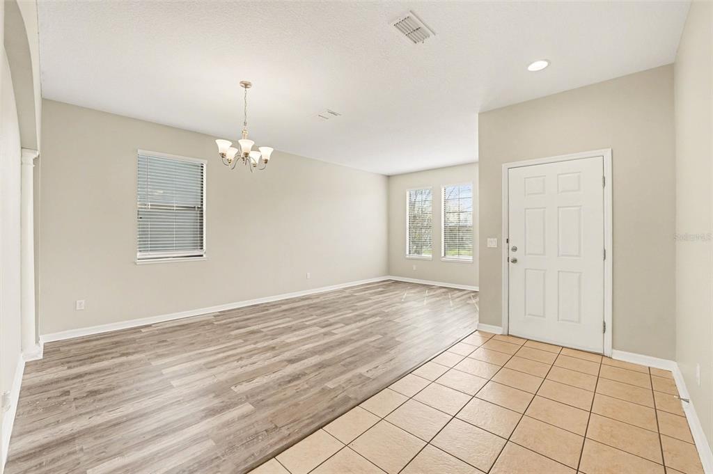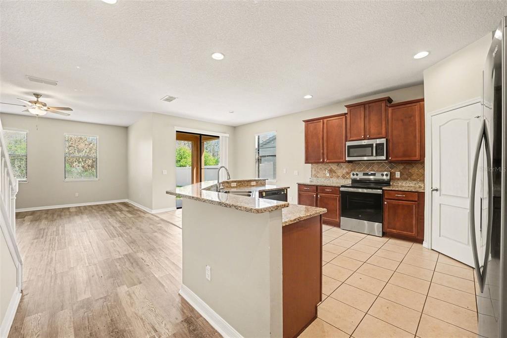 This residence features a thoughtfully designed two-story layout that balances formal and casual living. Upon entry, you are greeted by a formal dining room that flows seamlessly into an expansive open-concept kitchen. The kitchen is a standout, boasting elegant granite countertops, stainless-steel appliances, and ample workspace for meal preparation and entertaining.