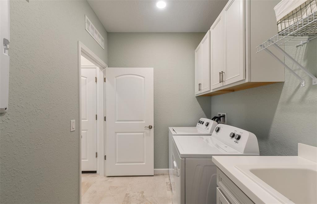 Welcome to the Prosperity by Pulte, where convenience and luxury meet in perfect harmony. This stunning single-story home offers 2 spacious bedrooms, an enclosed flex room, and 2 beautifully appointed bathrooms. The heart of the home is the gourmet built-in kitchen, showcasing elegant Dana White cabinetry paired with Quartz countertops. Thoughtfully designed features like soft-close drawers, easy-reach corner cabinets, double roll-out trays, and a waste basket drawer make the kitchen as functional as it is beautiful. The Whirlpool stainless steel appliances—including a built-in cooktop and a refrigerator—ensure you have everything you need for both everyday meals and special occasions. The open-concept design seamlessly flows into the gathering room, making this space perfect for both cooking and socializing. The spacious kitchen island is ideal for meal prep or casual dining, while the covered lanai just outside invites effortless indoor-outdoor living. The private owner’s suite, located at the rear of the home for ultimate privacy, offers a serene escape with an en suite bathroom featuring quartz-topped dual vanity sinks and a glass enclosed shower with a built-in bench. At the front of the home, the spare bedroom, bathroom, and versatile enclosed flex room ensure that everyone has their own space. Shaw wood-look luxury vinyl plank flooring spans the home, providing both style and durability, with tile in the laundry room and bathrooms for a sleek, modern touch. This home also comes equipped with a variety of modern conveniences, including a smart thermostat and video doorbell, and LED downlights. Comfort height toilets, 2” faux wood blinds, matte black lighting and hardware, a Whirlpool washer and dryer, and Sherwin Williams Snowbound interior paint add both style and ease to daily living. With its exceptional design, sophisticated finishes, and smart features, this Prosperity home is the epitome of both comfort and luxury—perfectly tailored to fit your lifestyle.