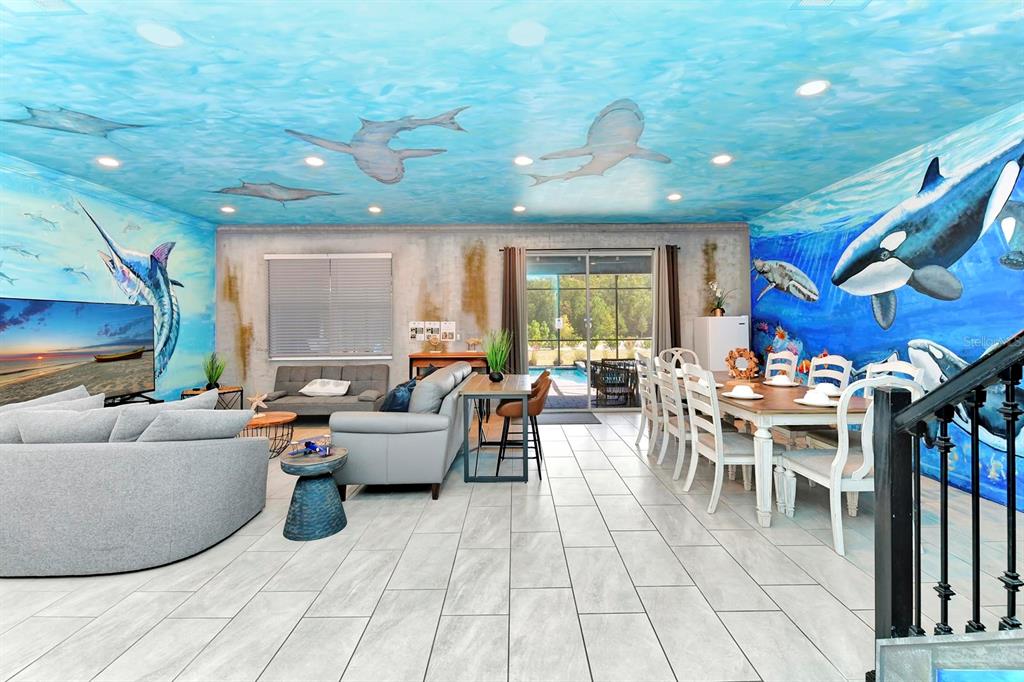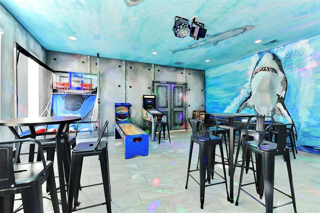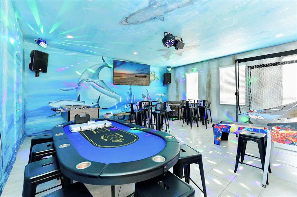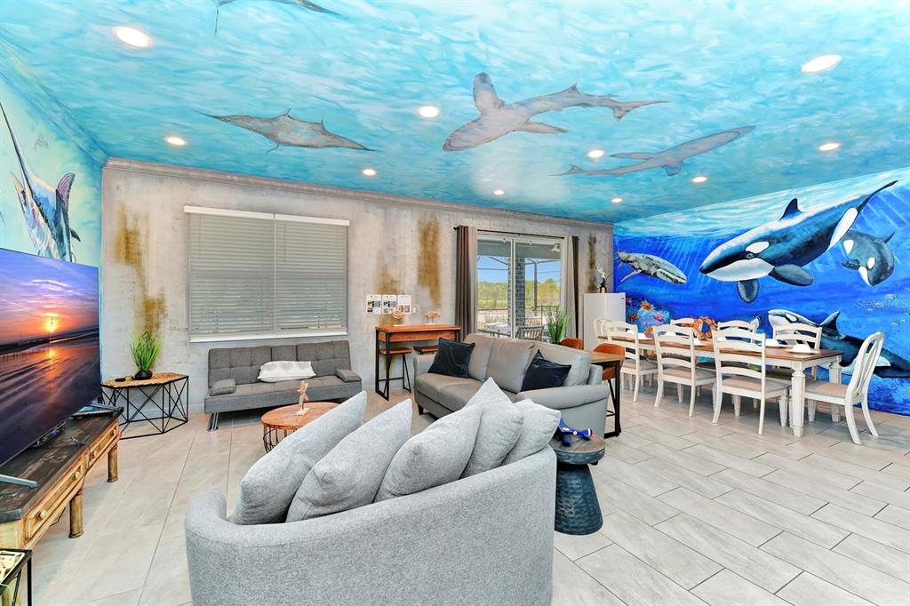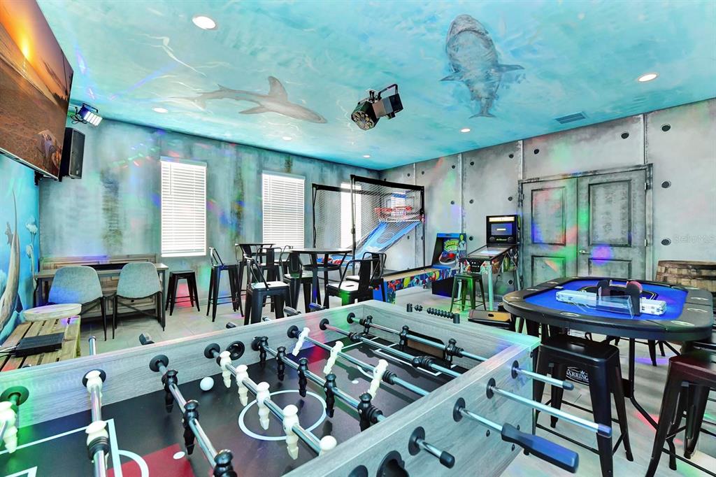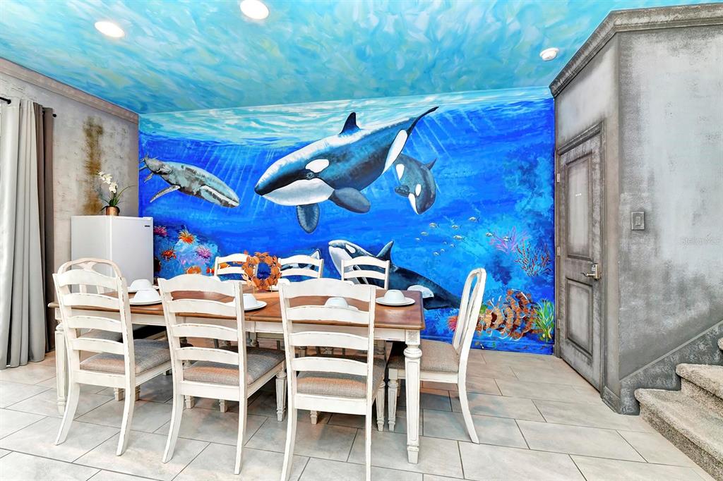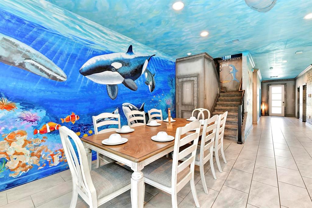 Don’t miss this opportunity, this is truly a ONE-OF-A-KIND vacation home! This beautiful 9-bedroom, 5-bathroom home is a work of art with the entire home’s interior painted by a professional artist with an aquatic theme. Located in Storey Lake, one of the most popular vacation rental communities in the Central Florida, it’s just minutes to the Disney entrance. The home has a fantastic location within the community as it’s just a 2-minute walk to the fabulous clubhouse and amenity center! The home is being sold fully furnished and it offers loads of space to entertain and features an open concept floor plan. The kitchen has quartz counter tops, 42″ white cabinets, beautiful black appliances and a large breakfast bar. All the bathrooms have waterfall shower panels and LED lighted mirrors. The huge combination living room and dining room make it the perfect home for large groups and family gatherings and there’s a magnificent games room for everyone to enjoy as well as a karaoke room! It even has 2 water heaters so guests with large groups will never run out of hot water! It features a massive covered lanai with an outdoor kitchen for those afternoon cook outs, a brick paver deck and large heated pool and spa, and best of all it backs up to a conservation area so there are no rear neighbors!…This premier vacation resort community offers top of the line amenities including a grand clubhouse with concierge services, a restaurant and Tiki bar, resort style swimming pool and spa with a lazy river, water slides and cabanas surrounding the pool, an arcade, fitness center, business center, and even a theater! Storey Lake has a great location with easy access to Disney, Universal, Sea World and all that Central Florida has to offer! This home has to be seen to be believed!
