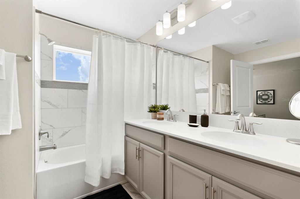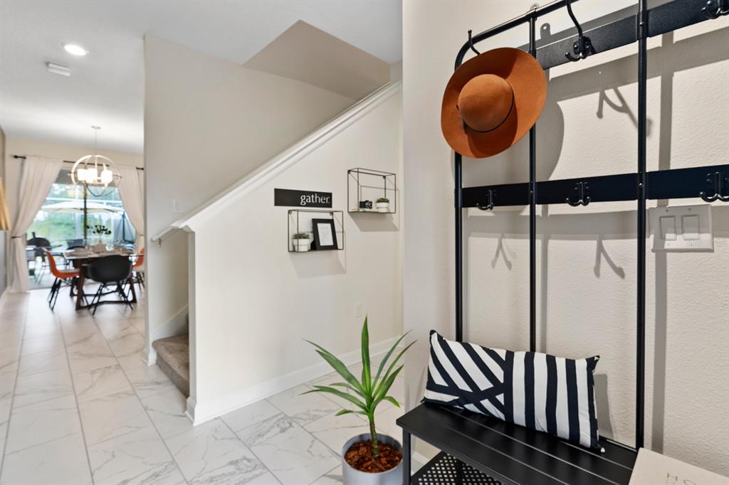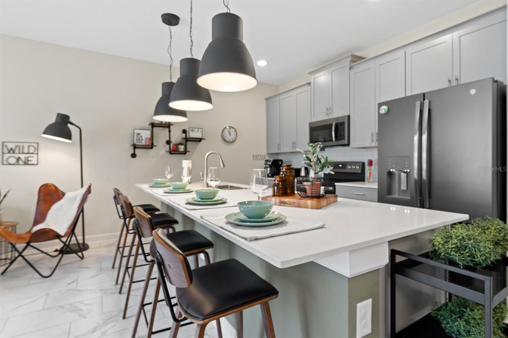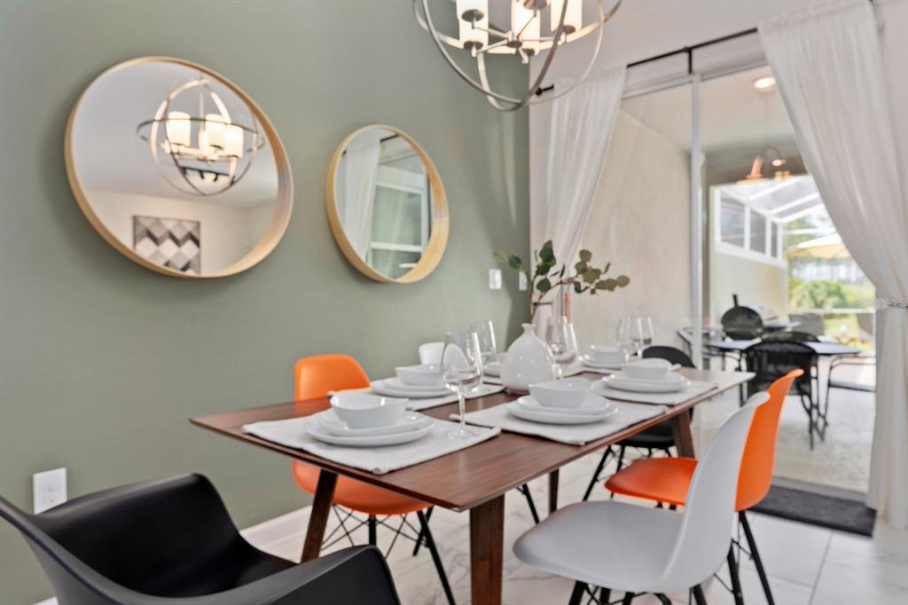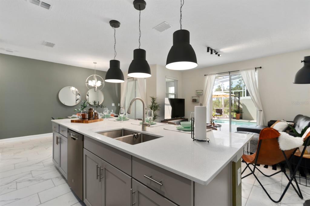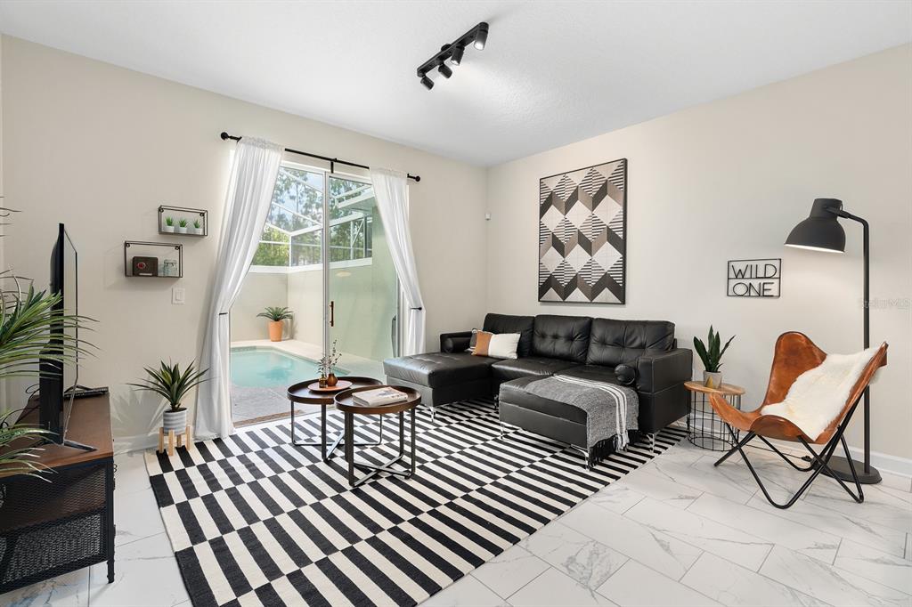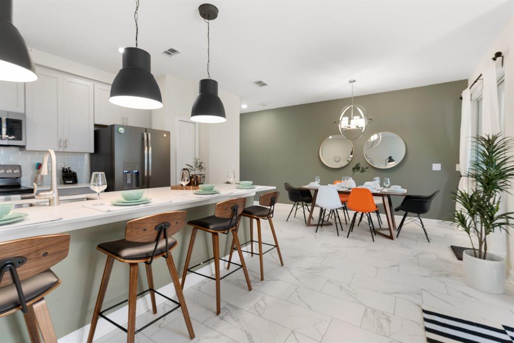 INCOME READY INVESTMENT OPPORTUNITY!! 4 bedroom/3 bath POOL home. This home is being sold FULLY FURNISHED and it is currently configured to sleep up to 10. The home has been on a short-term rental program with full of future bookings in place. A welcoming foyer showcases a sweeping staircase and beautiful tile flooring that runs throughout the main living areas. To the right of the foyer is a large private bedroom perfect for guests and situated close to the guest bathroom featuring granite countertops and a walk-in shower. At the back of the home enjoy an open concept living space where you will find a large living room, spacious dining room, and modern kitchen. The sliding doors will lead you to the enclosed lanai and beautiful pool. The kitchen features modern cabinetry and granite countertops including a large kitchen island for extra seating and stainless steel appliances. Upstairs you will find the large master suite with carpet, a large closet and adjoining bathroom. There are two more large bedrooms and a guest bathroom on the second floor. A laundry closet is near the bedrooms. Step outside and splash into the inground heated pool. Champions Gate is full of amenities, including a guard gated entrance, a signature golf course, a clubhouse with lazy river/pool, playground, IT center, tennis courts, tiki bar, fitness center, arcade, volleyball and much more. This home is just minutes from the theme parks, as well as shopping, dining & more.