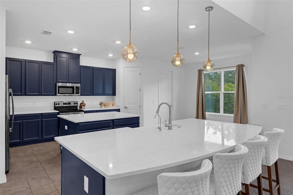 Step into a grand foyer with immediate access to a formal dining room and a versatile flex/office space. The heart of the home is the expansive great room, seamlessly connected to the chef’s kitchen. Enjoy custom upgraded wood cabinetry, quartz countertops, two prep islands (one with a farmhouse sink), a large walk-in pantry, a butler’s pantry connecting to the dining area, and a spacious laundry room just off the kitchen. Upstairs you’ll find three additional bedrooms, a full bathroom, a large loft perfect for a game room or secondary family room, and a media/bonus room for endless entertainment possibilities.