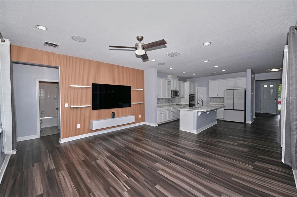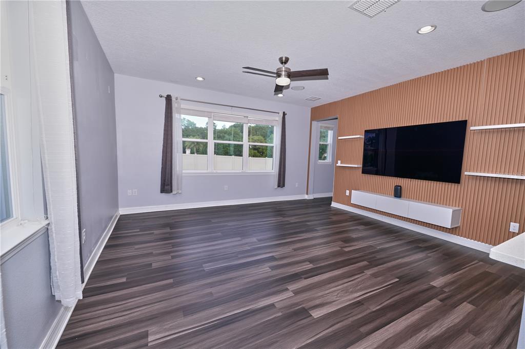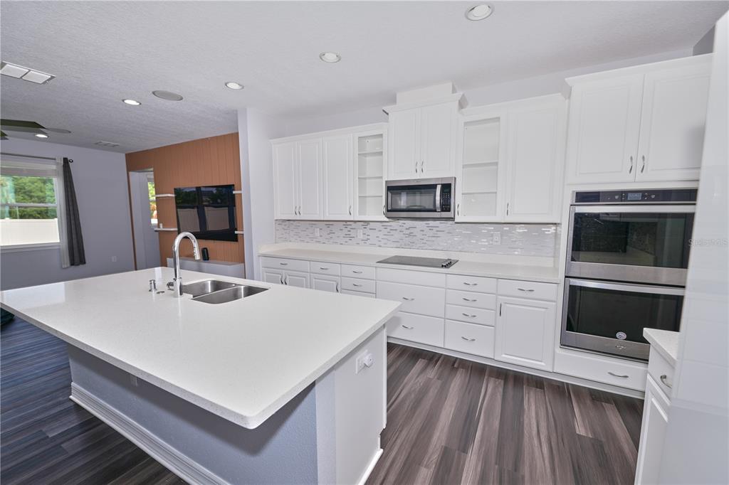 As you enter, you are welcomed by a spacious flex area and 9-foot ceilings throughout the first floor, enhancing the open and airy feel. The heart of the home is the fully upgraded modern kitchen featuring white cabinetry, quartz countertops, stainless steel appliances, built-in double oven, cooktop, a large center island, and a spacious walk-in pantry, all opening seamlessly to the family room highlighted by a custom accent wall with built-in shelving—perfect for everyday living and entertaining.