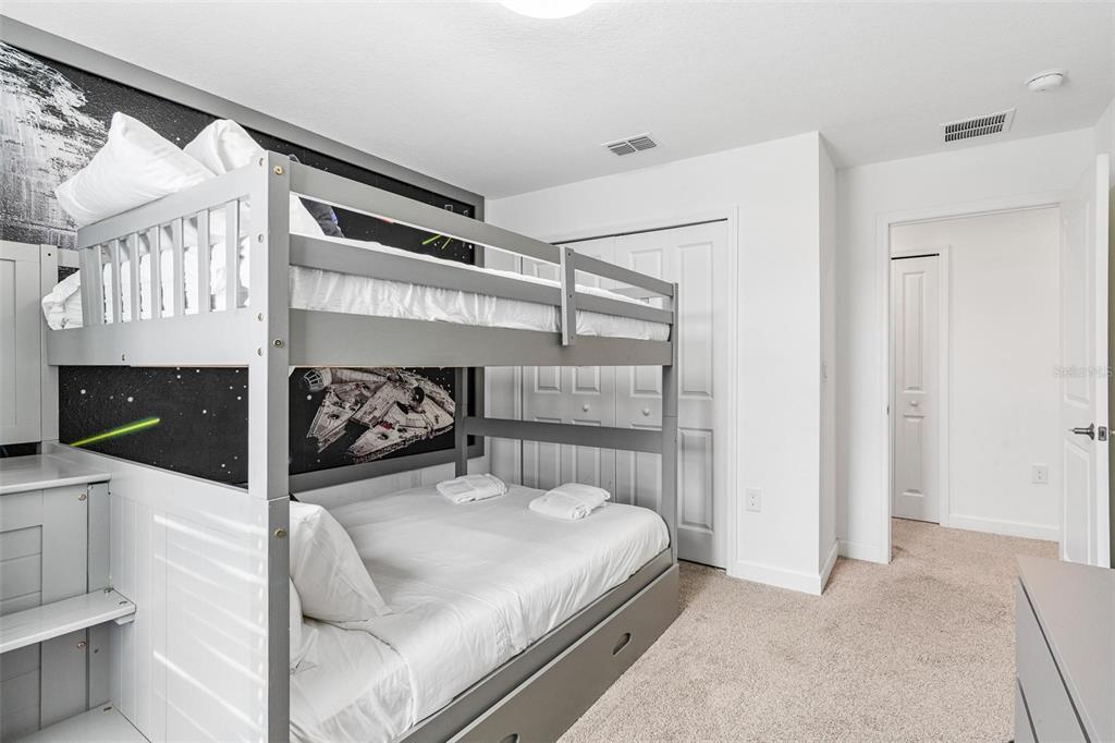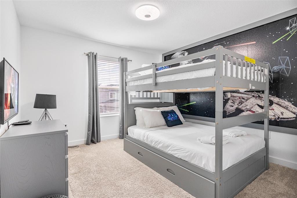 Each bedroom offers its own charm, with two specially designed themed rooms—Disney and Star Wars—that are sure to delight kids and guests alike. The primary suite provides a peaceful retreat with its own en-suite bath, while the additional bedrooms offer flexibility for family, visitors, or a home office.