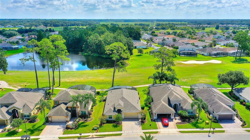Welcome home to Del Webb Orlando! Truly exceptional 55+ resort-style living located in the gated golf community of Ridgewood Lakes. Convenient to shopping, hospital, restaurants, theme parks, airport and just a little over an hour to some of the world’s most beautiful beaches! Just what you have been waiting for! PREMIUM LOT on GOLF COURSE with LAKE VIEW, POOL & SPA!! While away the hours sipping your beverage of choice on the part covered, part open screened lanai while overlooking your gorgeous pool and spa. Enjoy the golf course/lake view and the beautiful wildlife while taking in the serene sunrise. This 2 bedroom 2 bath plus office/den (easy conversion to 3rd bedroom) will impress with it’s screened front porch and grand entry. Feel the space of the soaring ceilings and sliding glass pocket doors that open to the ample lanai. Gourmet kitchen with WOLF Gas range, granite countertops, large pantry and cozy dinette off the kitchen to savor your morning coffee while taking in the view! Rich wood cabinetry with rollouts. Open concept Gathering Room and Formal Dining Room. Spacious Primary Suite Respite featuring with walk in closet, glass slider to lanai, ensuite bath with garden tub, and separate shower. Split bedroom concept offering plenty of privacy for you and your guests. Interior laundry room with sink and large closet pantry,. Tons of upgrades including PLANTATION SHUTTERS, EXPANDED PAVER DRIVEWAY, GENERAC GENERATOR, NEW ROOF 2025, NEW AC 2023, NEWER CARPET! LAWN MAINTENANCE INCLUDED IN HOA FEE! Bringing a furry friend? You will love the dog park with separated areas for large and smaller pups, complete with a doggie water station! The resident owned Montecito Clubhouse is a state-of-the-art facility with 30,000 square feet of amenities. Complete with fitness center, indoor walking track, dance/aerobic studio, ballroom, craft rooms, resort-style outdoor pool, and even an indoor pool and hot tubs! Grab a bite to eat and your favorite beverage at La Tapenade Tavern where you can also enjoy live music, karaoke, trivia, and bingo Wednesday – Saturday. Looking for more activities? Try your hand at pickleball, shuffleboard, tennis, bocce ball, or basketball. How about a relaxing day playing golf at Ridgewood Lake’s White Heron Golf Club? Take a stroll along the picturesque walking paths by the beautiful lakes or try your luck hooking a fish on the fishing dock. 24/7 GUARDED GATE ACCESS. BONUS – This community has NO CDD! You’re just minutes away from everything you need. Call today to schedule your private showing!