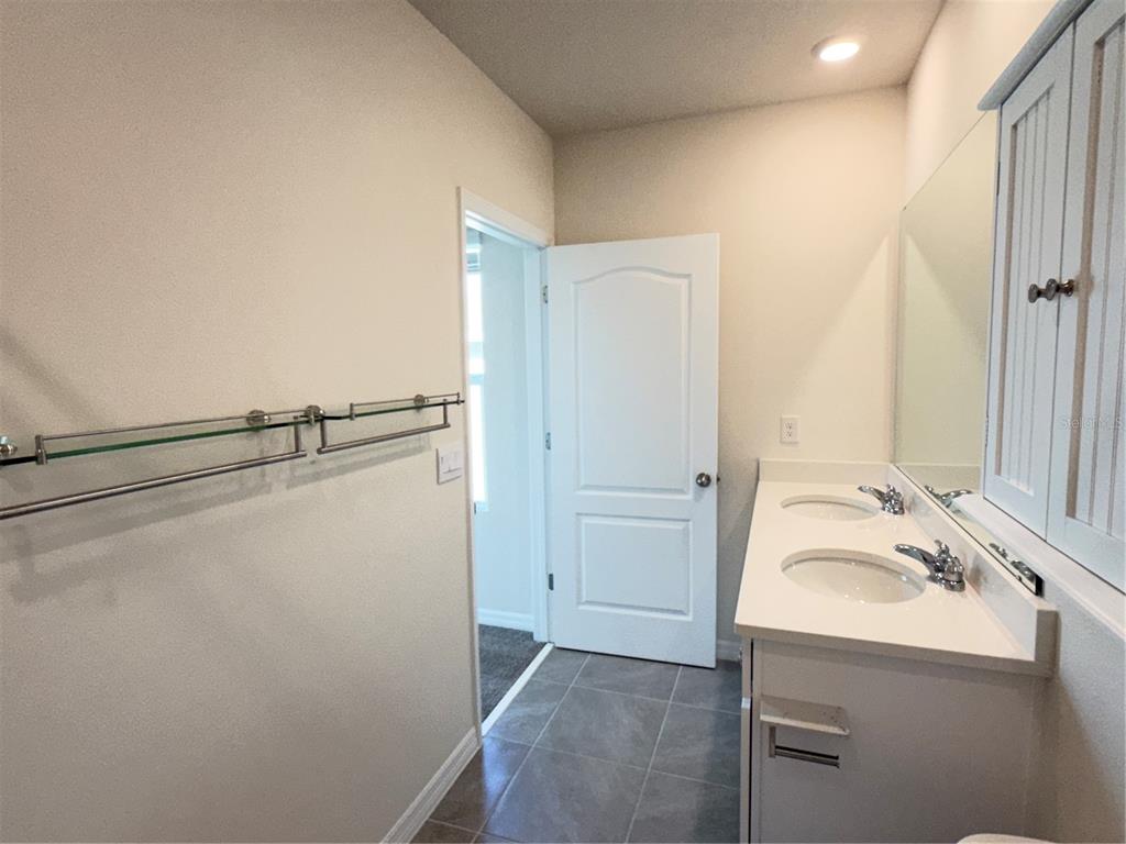 The spacious master suite offers a bright, airy retreat featuring a walk-in closet and a dual sink vanity in the en suite bath.