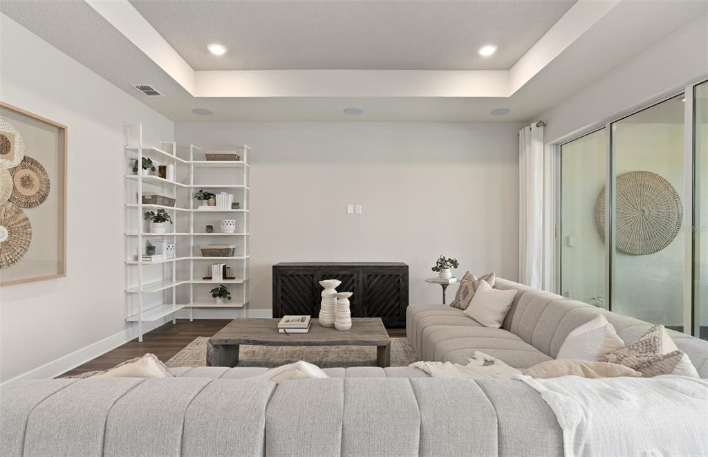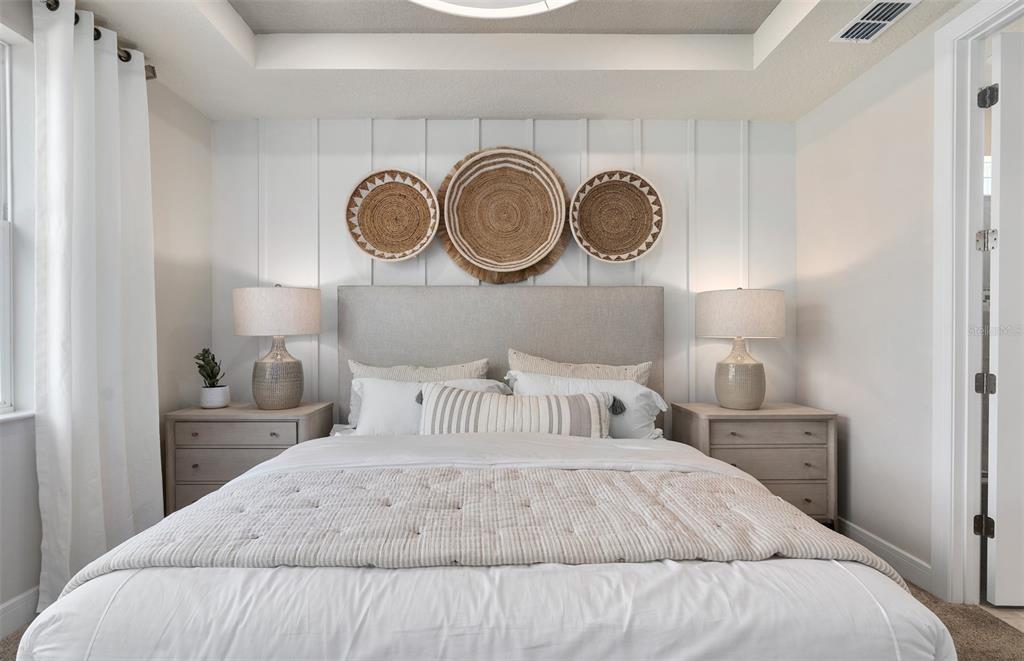 Welcome to the Crestmere home by Pulte, where modern elegance meets practical design. This new construction, single-story home features 3 bedrooms, 2 bathrooms, a covered lanai, and a 2-car garage—creating the perfect space for comfort and style. The open-concept kitchen, café, and gathering room are bathed in natural light, offering a bright and airy atmosphere. With tall ceilings, abundant windows, a glass insert at the front door, and a sliding glass door leading to the covered lanai, the space effortlessly flows between indoor and outdoor living. The kitchen is a stunning focal point, designed for both beauty and functionality. It includes stainless steel Whirlpool appliances—featuring a refrigerator and microwave vented to the exterior— White soft-close cabinetry, quartz countertops, a decorative tile backsplash, an upgraded faucet, and a sleek stainless-steel single bowl sink. Whether you’re cooking or hosting guests, this kitchen is sure to impress. At the rear of the home, the owner’s suite provides a serene retreat. The spa-inspired en suite bathroom is complete with a frameless glass-enclosed shower, a quartz-topped dual vanity, and a spacious walk-in closet—offering a tranquil escape. The front of the home includes two additional bedrooms and a full bathroom, offering privacy and convenience. Designer-curated finishes add an extra touch of luxury, including a Whirlpool washer and dryer and 2” faux wood blinds. Throughout the main living areas, bathrooms, and laundry room, the home is outfitted with tile flooring. Plush, stain-resistant Shaw carpet adds a cozy feel to the bedrooms, making each space a comfortable and inviting retreat. Modern technology features include a smart thermostat, smart doorbell, and LED downlights, ensuring the home is as connected as it is stylish. With its thoughtful design, luxury finishes, and seamless blend of functionality and beauty, the Crestmere home is the perfect place to live and unwind.