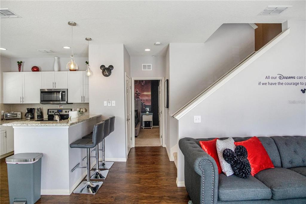 The main floor features an open layout that flows easily between the living room, dining area, and kitchen, making it great for both relaxing and entertaining. The kitchen is finished with granite countertops, stainless steel appliances, and a bar-top for extra seating. There’s also a primary bedroom on the first floor, which adds flexibility for owners or guests.