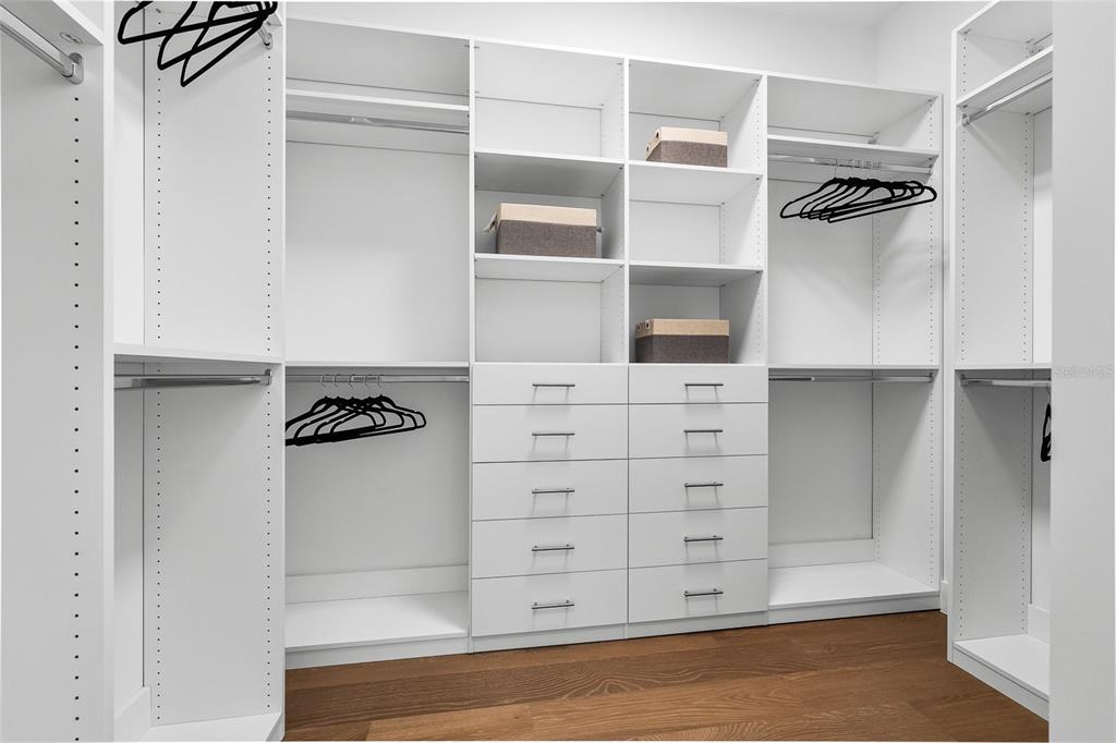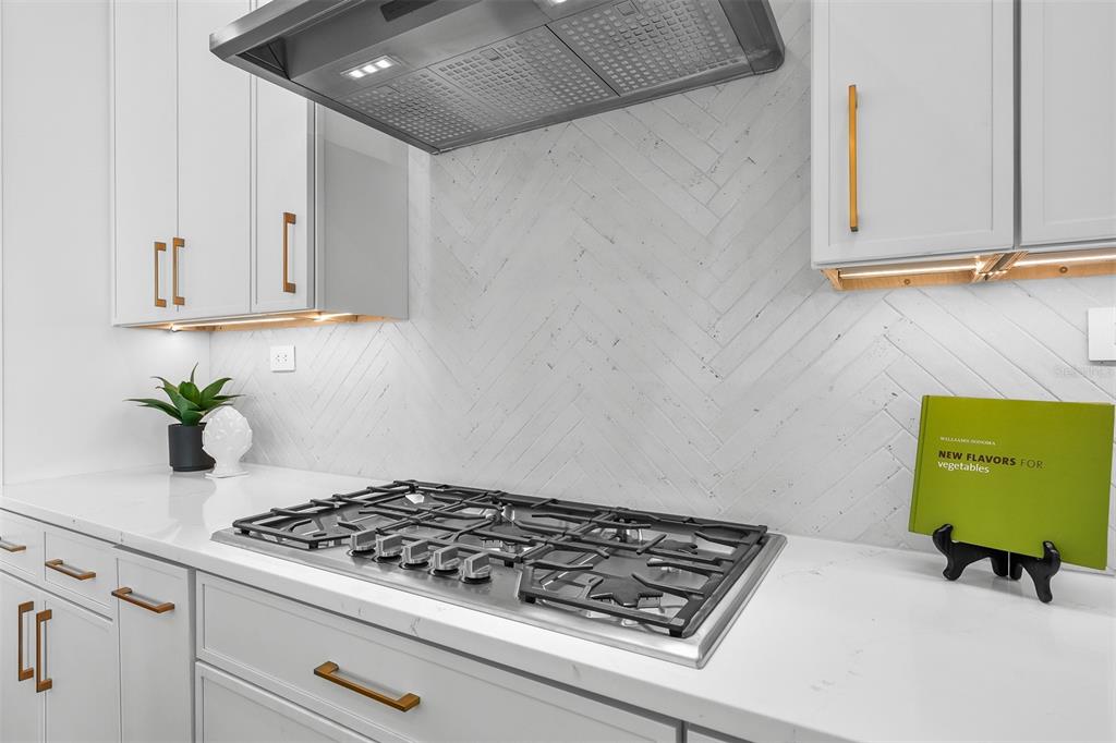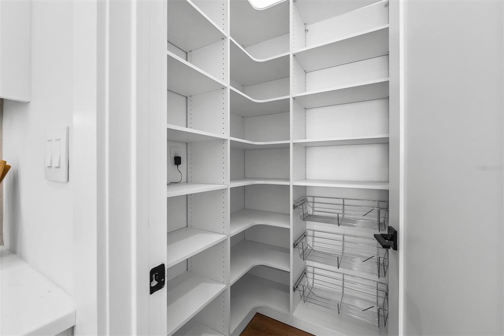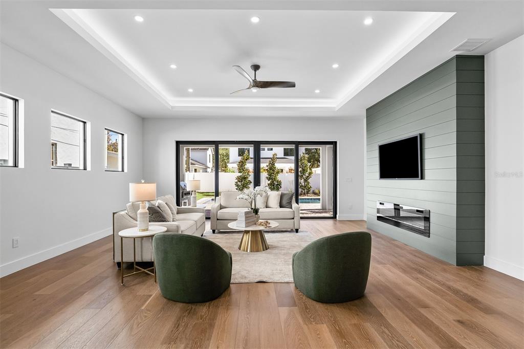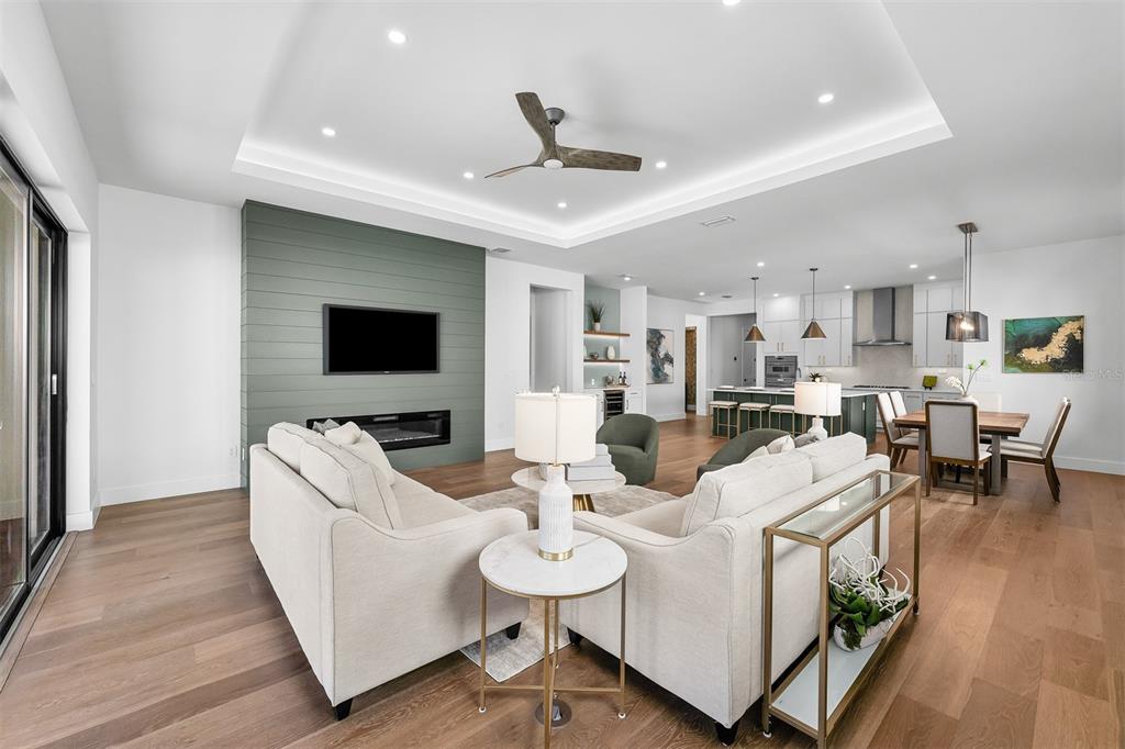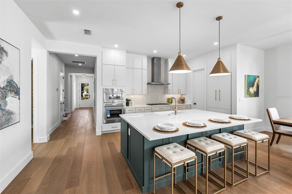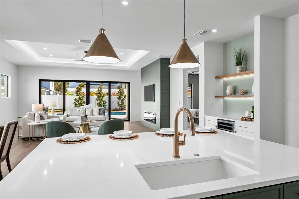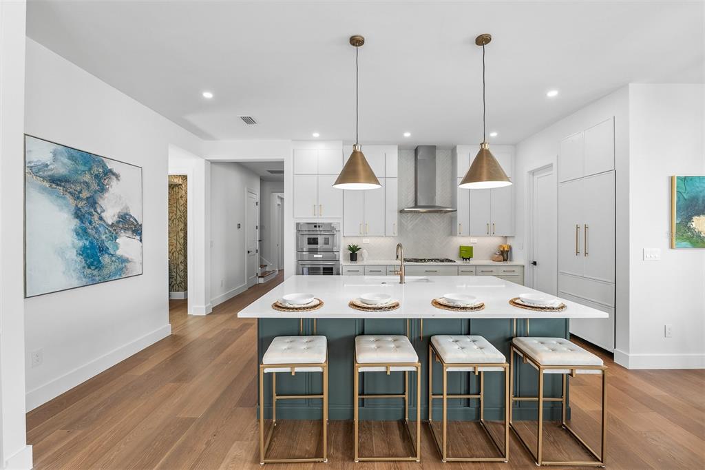Designed for both everyday comfort and elevated entertaining, the open-concept floor plan showcases thoughtful design and top-tier finishes throughout. The expansive gourmet kitchen is a chef’s dream, featuring premium Thermador appliances, including a 36” gas cooktop, wall oven, built-in microwave, paneled built-in refrigeration, and an amazing custom pantry— all accented by sleek cabinetry extending to the ceiling and contemporary detailing. A built-in coffee bar and wine cooler add extra serving space off the kitchen, perfect for entertaining guests.