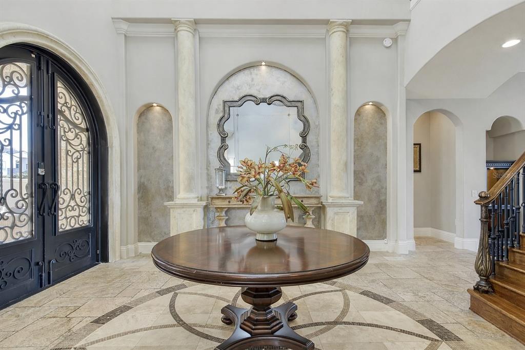 Beyond The Private Wrought-Iron Entry Gates, An Elegant Courtyard Welcomes You With A Serene Sitting Area And A Detached Guest Suite — Currently Styled As A Recording Studio — Offering Both Privacy And Versatility. From There, Grand Solid Metal Doors Open Into A Dramatic Foyer Adorned With Travertine Flooring, A Motorized Drop-Down Chandelier, And A Stunning Hardwood Staircase Accented With Wrought-Iron Detailing.