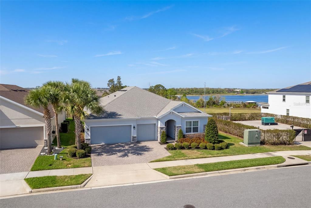 The homesite provides added privacy with only one immediate side neighbor, while the backyard is positioned to enjoy lake views and west-facing sunset exposure, creating a peaceful outdoor setting for relaxing or entertaining.