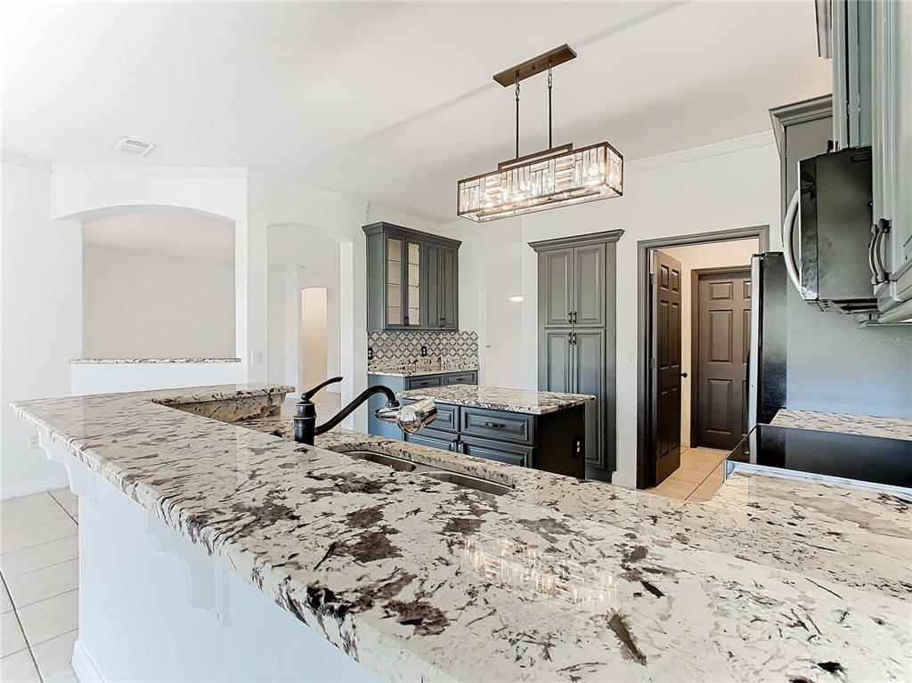 equipped kitchen which boasts new appliances, custom cabinets, breakfast bar, closet pantry and plenty of counter space with the