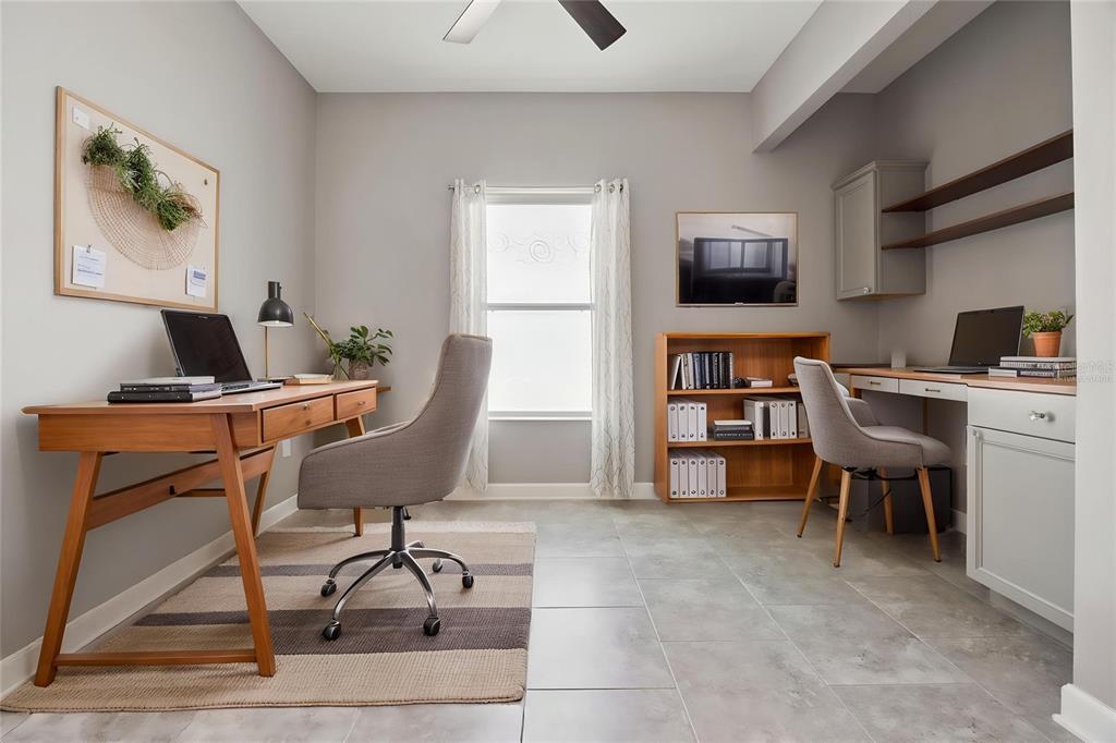 One or more photo(s) has been virtually staged. Sought after Heritage Hills is a vibrant 55 plus community located in beautiful Clermont! This popular St Marten villa has 2 bedrooms with 2 bathrooms plus a flex room and a 1 car garage. This end unit allows for lots of natural light in the villa and there is an extended screened lanai for enjoying the Florida outdoor weather! This open floor plan is perfect for entertaining! In the kitchen you will notice all the cabinet space, granite counter tops, breakfast bar with pendant lighting plus a pantry! All tile throughout the living area with carpet in the 2nd bedroom and laminate in the primary bedroom. The primary suite includes an oversized walk in closet, dual sink granite counter tops and a walk in shower. The flex room can be used as an office, additional sitting room, craft room, etc. and has a built in desk area! The secondary bedroom is private from the rest of the main living area and makes a perfect guest room. Upgraded ceiling fans and light fixtures! NEW GE large capacity washer and dryer also stay! All window treatments stay and the sliding door in the family room has sliding panels for easy opening and closing! Heritage Hills amenities include a heated pool and spa, pickle ball, tennis, basketball, bocce ball, shuffleboard, clubhouse with planned activities, fitness center, art and crafts room, billiard room, golf simulator, card room and ballroom for holding events. Exterior is painted every 5-6 years! Spectrum high speed internet and cable is included in the HOA fee. The roof is replaced at year 15 and the reclaimed irrigation water, is included in the HOA fee. There is a 5 mile walking trail around the community. Call today for a private showing!