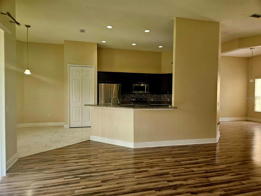 Step inside to discover a bright, open-concept living and dining space with elegant tile floors, high ceilings, and plenty of natural light. The gourmet kitchen features granite countertops, 42” cabinets, a breakfast bar, and stainless steel appliances—perfect for family gatherings and home chefs alike.