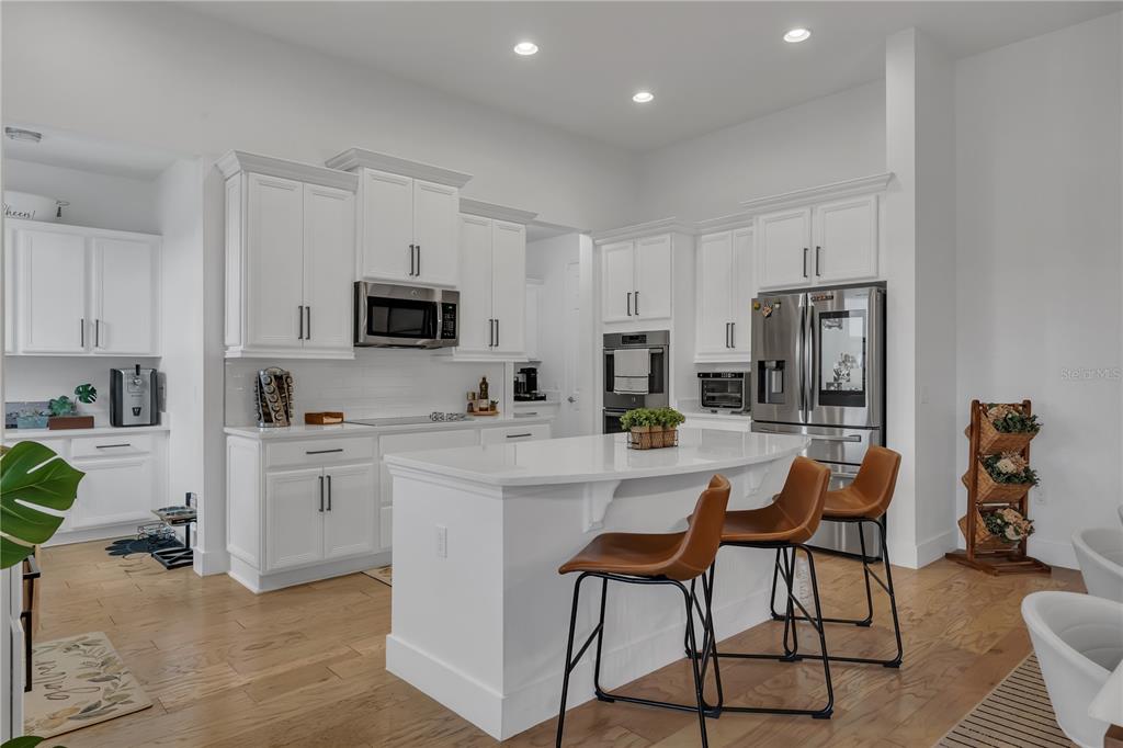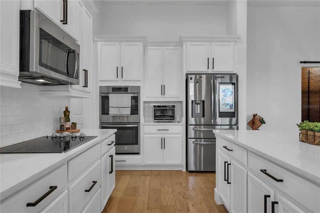 led recessed lighting, high quality cabinets with crown molding tops, built in wine cellar,
