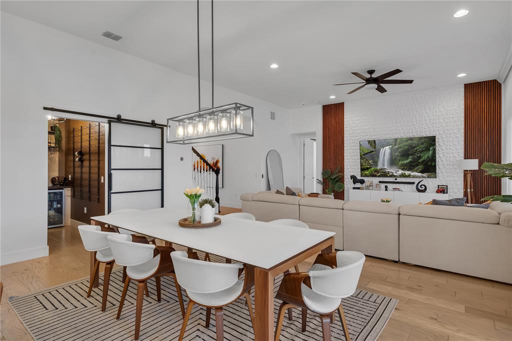 Walk in wine cellar with fitted wine racks and 2 wine coolers glass barn style sliding door.