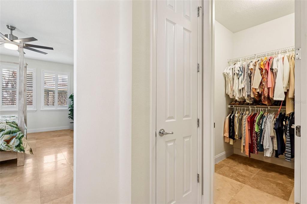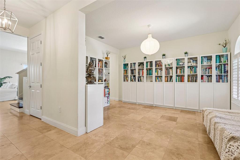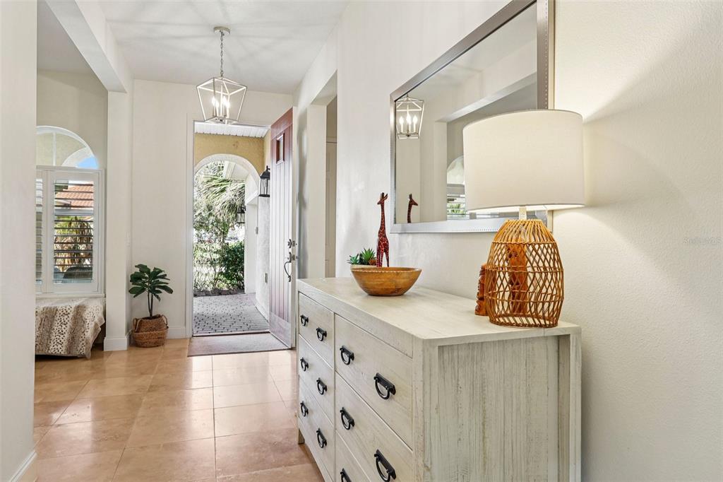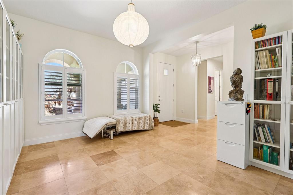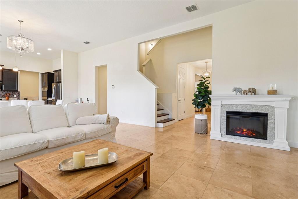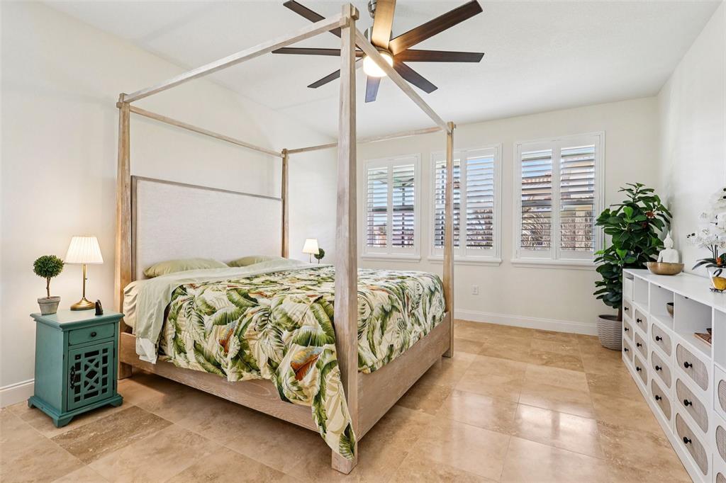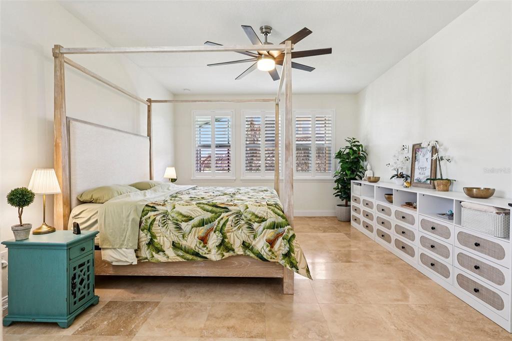 The interior is gracefully defined by soaring high ceilings, abundant natural light, and a seamless fusion of elegance and functionality, creating an inviting yet luxuary-level atmosphere ideal for both everyday living and upscale entertaining. The main living areas showcase travertine flooring, a striking wood staircase, and plantation shutters throughout, delivering a cohesive and timeless design.