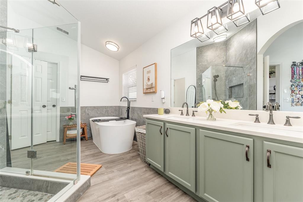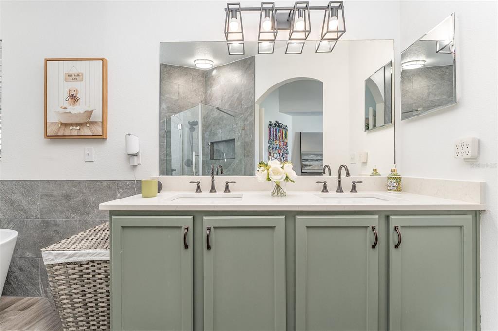 The spacious primary suite is a true retreat. Enjoy a luxurious floating soaking tub with a custom tray perfect for reading or relaxing with a drink, a fully tiled walk-in shower that reaches the ceiling, an 18″ recessed niche for tall bath products, dual vanities, and an oversized walk-in closet.