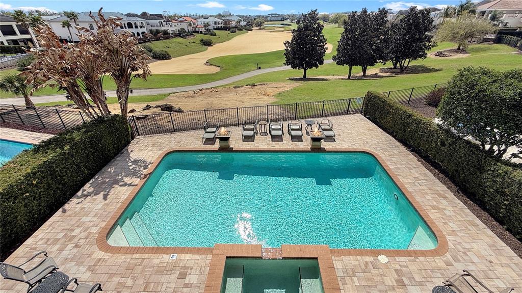 The south-facing pie-shaped homesite is the true centerpiece, offering all-day sunshine across the expansive pool terrace and unobstructed golf course views that stretch toward the evening sky. Lounge by the private resort-style pool, gather around the dramatic dual fire bowls, or unwind as the sun sets across the fairways — creating a setting that feels like your own private five-star retreat.