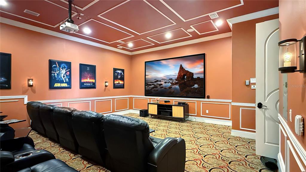 Entertainment reaches a new level in the private theater room, featuring 12 plush reclining seats and a high-definition projection system, delivering an immersive cinematic experience right at home.