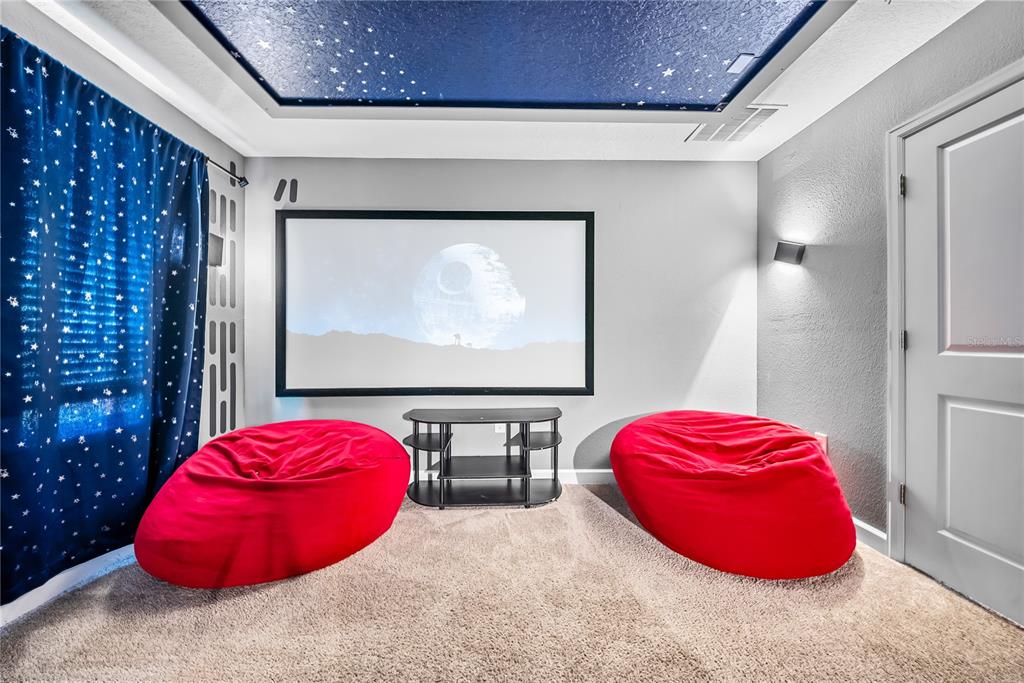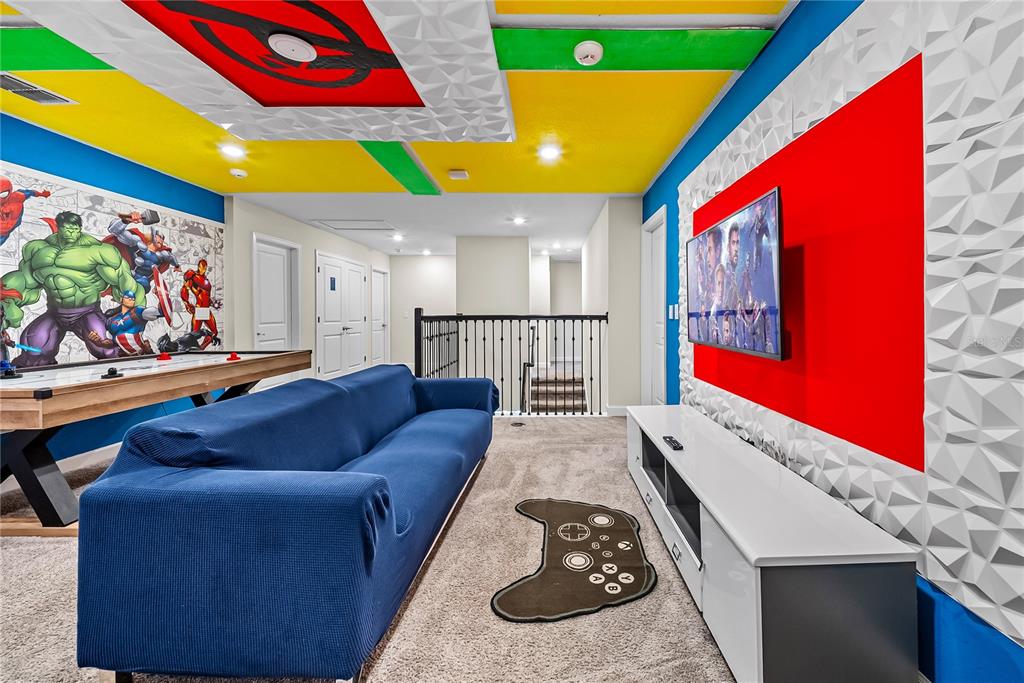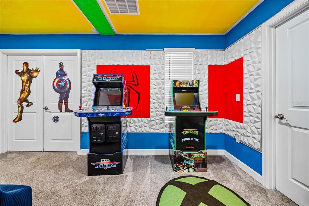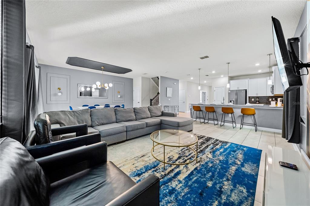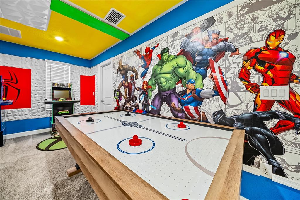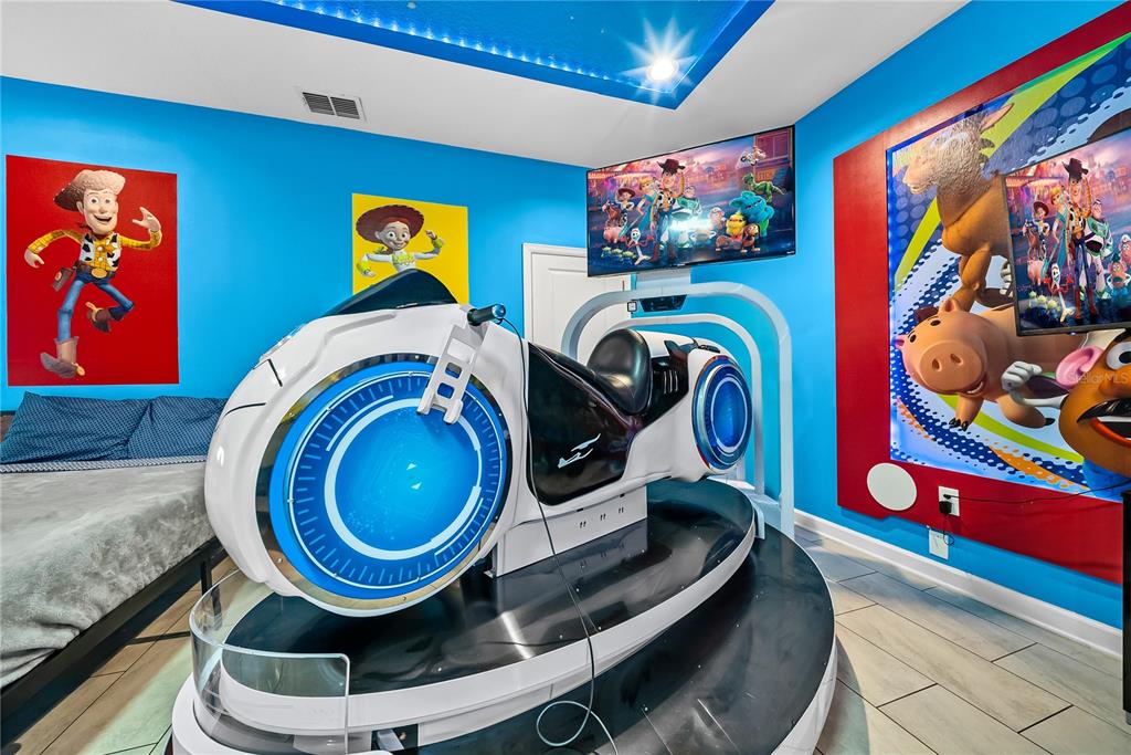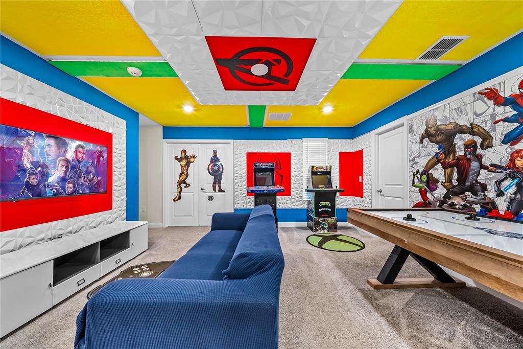 Spectacular 8-bedroom, 5-bath vacation home located in the highly desirable Storey Lake Resort, offering an unbeatable location near Orlando’s major attractions, shopping, and dining. This sought-after Santiago model, the largest and most popular floor plan in the community, is a proven income-producing property and is being sold fully furnished and turn-key. The home features a well-balanced and functional layout designed to comfortably accommodate large groups, making it ideal for multi-generational stays or short-term rental use. The first floor welcomes you with an inviting foyer and includes a full bedroom, a spacious kitchen with large breakfast bar and pantry, and open living and dining areas enhanced by modern finishes and quartz countertops throughout. Sliding glass doors lead to a covered patio and screened private pool, creating seamless indoor-outdoor living. The main level also includes a custom themed game room equipped with a VR machine, while upstairs you’ll find a spacious loft/media area, additional themed spaces, and a conveniently located laundry room. The second level features the remaining bedrooms and bathrooms, offering ample privacy for guests. A private movie theater and thoughtfully designed themed bedrooms further elevate the guest experience and rental appeal. Storey Lake Resort offers exceptional amenities, including a resort-style clubhouse, fitness center, water park with slides and lazy river, tiki bar, playgrounds, and basketball, volleyball, and tennis courts. Located approximately 4 miles from Walt Disney World and minutes from Universal Studios, SeaWorld, and major highways, this property delivers both lifestyle and investment potential. Property management information and rental financials available upon request. An excellent opportunity for investors or buyers seeking a high-performing vacation rental in one of Central Florida’s most sought-after communities.